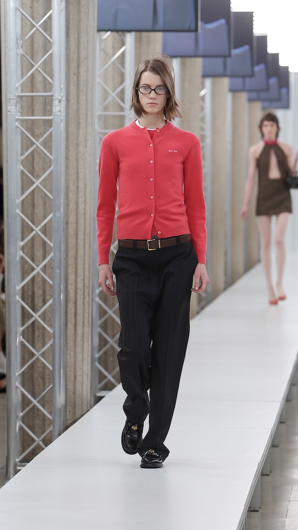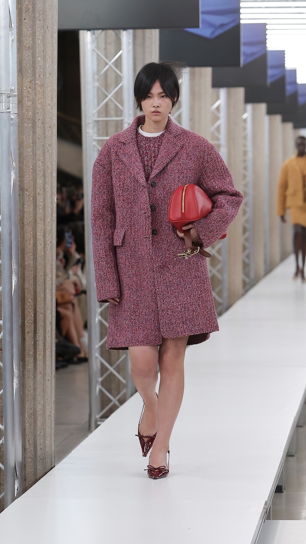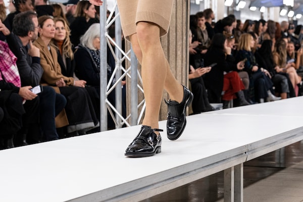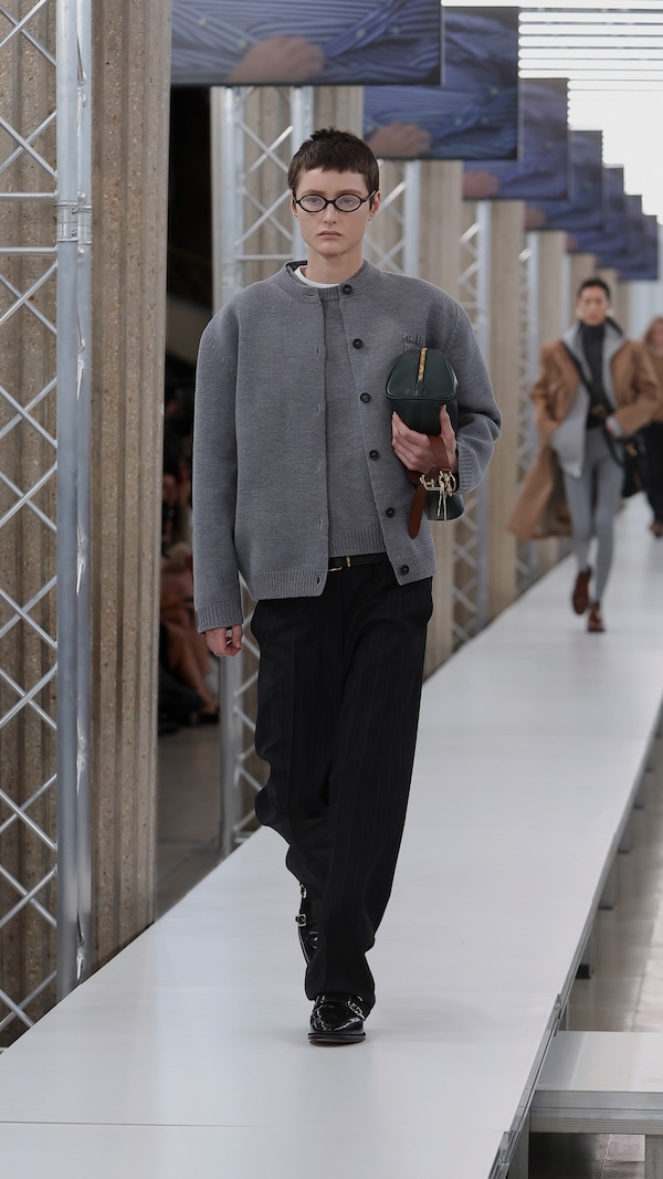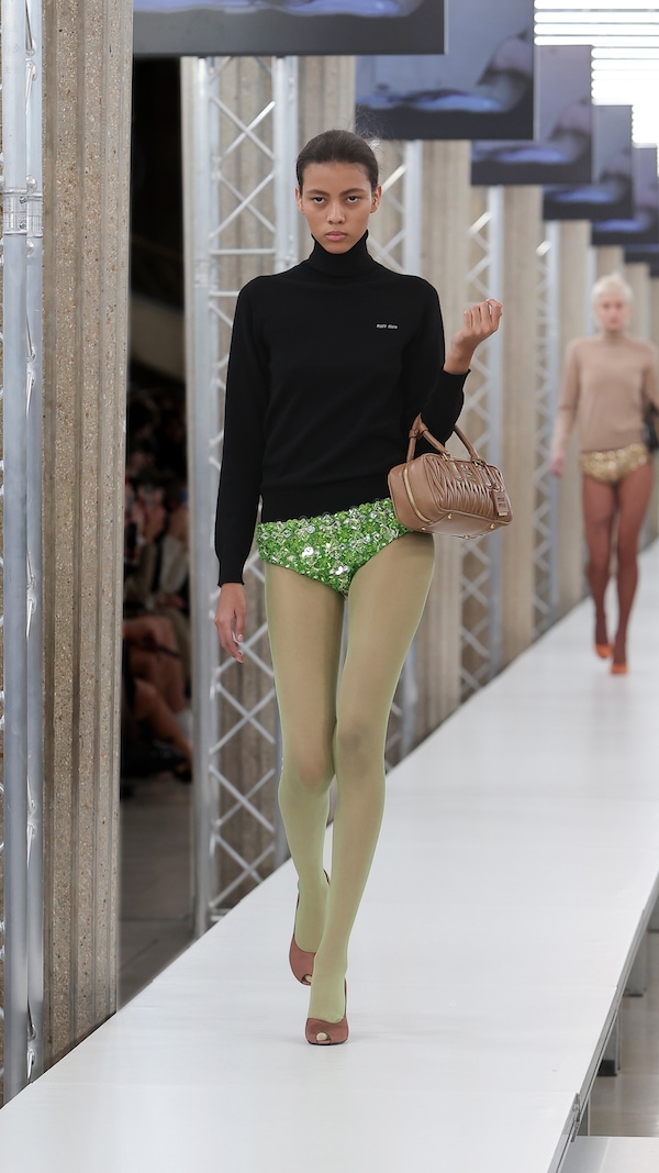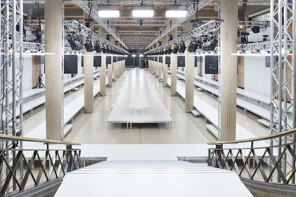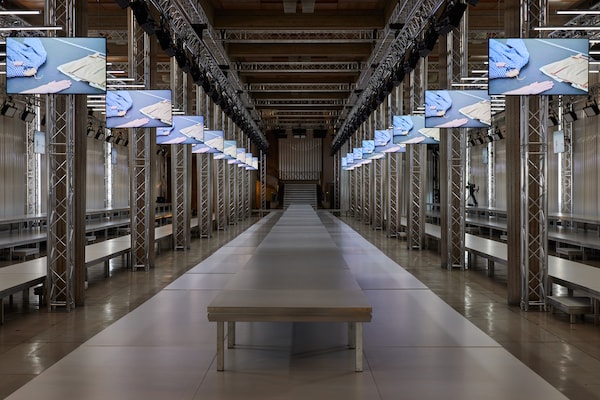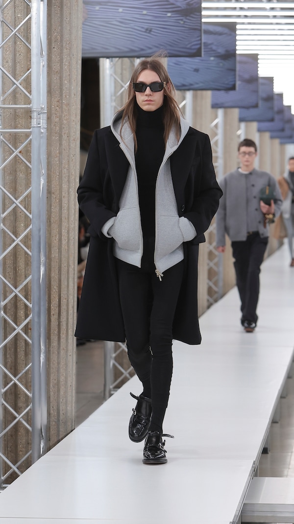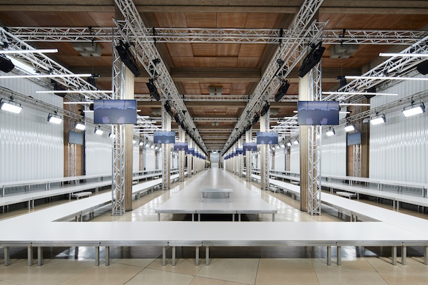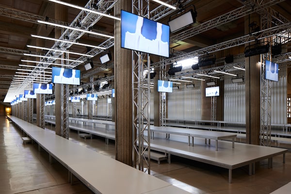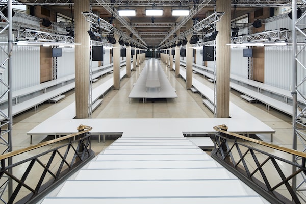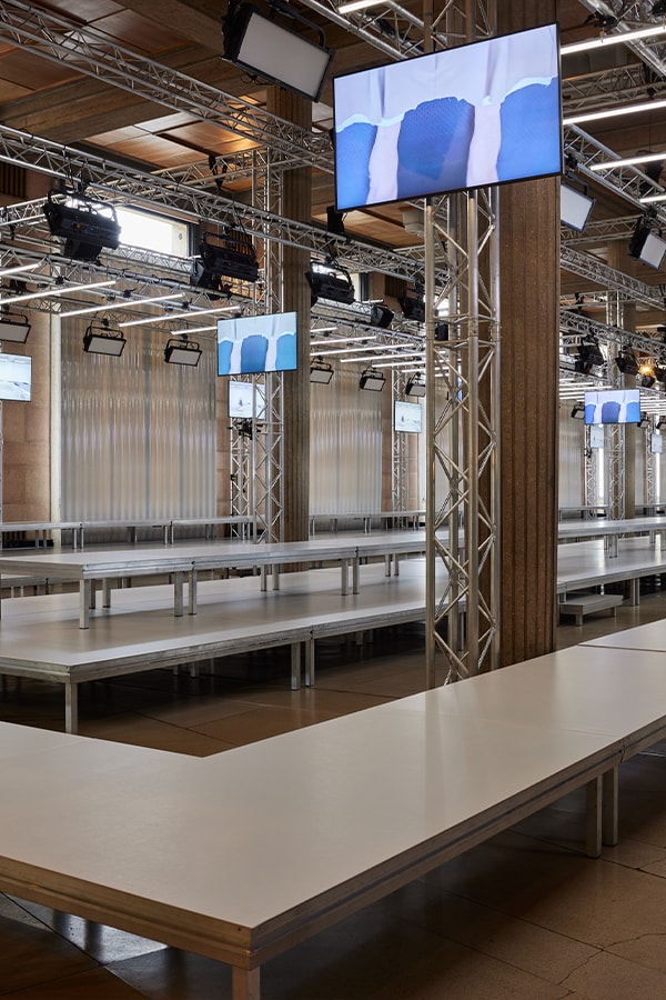 In the Palais d’Iena, models walk on a sequence of raised walkways to aid our observation. Alongside is an installation by South Korean artist Geumhyung Jeong whose performance-based pieces, centered around her body alone, demand an audience. Screens featuring Jeong’s specially-conceived work - examining the relationship between her own body and clothing - form punctuation to the space, inviting and arresting our attention, demanding to be watched.