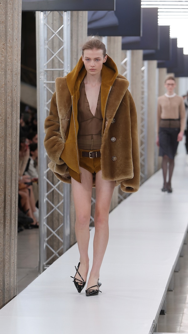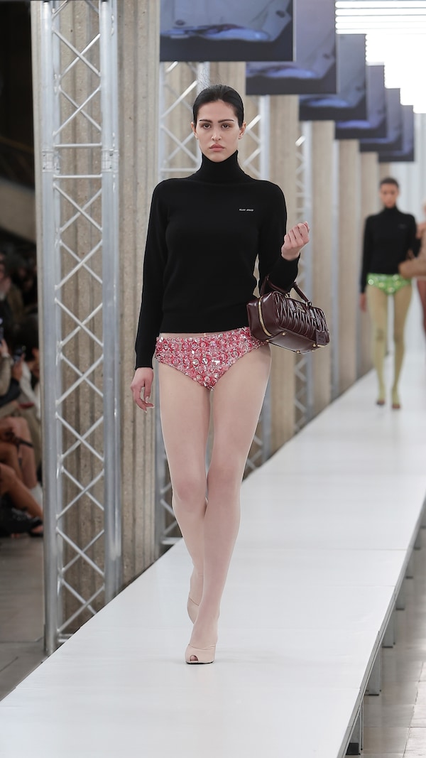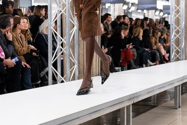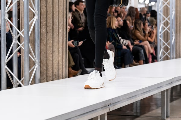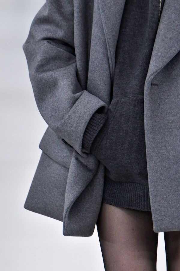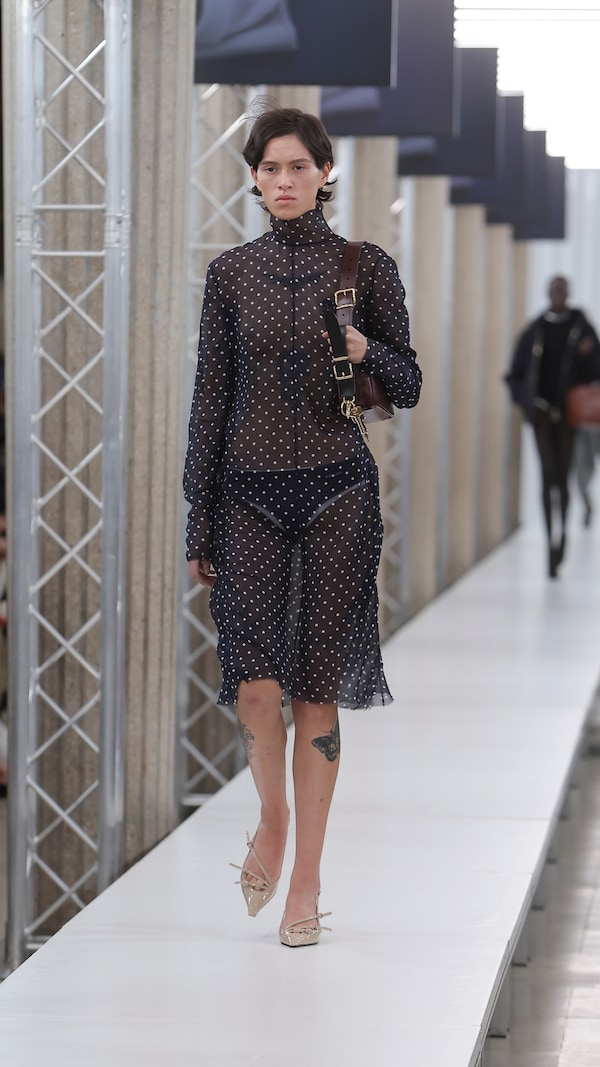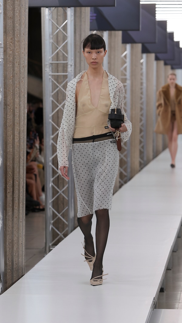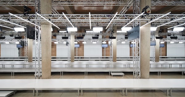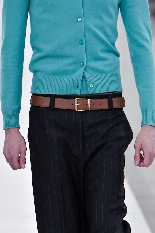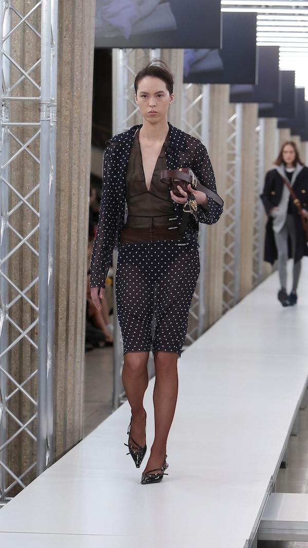 In the Palais d’Iena, models walk on a sequence of raised walkways to aid our observation. Alongside is an installation by South Korean artist Geumhyung Jeong whose performance-based pieces, centered around her body alone, demand an audience. Screens featuring Jeong’s specially-conceived work - examining the relationship between her own body and clothing - form punctuation to the space, inviting and arresting our attention, demanding to be watched.