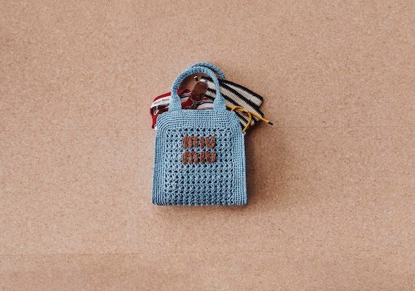 Miu Miu L’Été accessories include the Wander bag in natural wicker and cotton crochet-knit, wicker and striped cotton crochet-knit totes and baskets, mini bags, and the Ivy bag in white and natural raffia. Footwear includes Rivière sandals, deck shoes and eternal favorites: Church’s x Miu Miu and New Balance x Miu Miu shoes and sneakers.