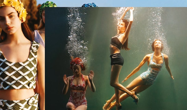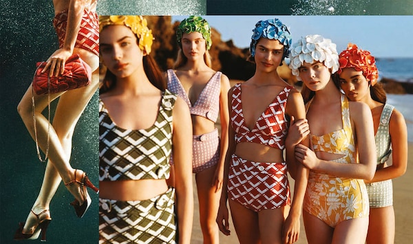 The Miu Miu SS’17 collection is in itself a collage of fun, feminine fashion evoking disparate eras, aesthetics, and guides for so-called age-appropriate dress. It is the next iteration of Miuccia Prada’s twisting and turning meditation on what a woman wants to wear, what she is expected to wear, what she has worn, what she can wear, and where those shifting ideas collide. The pairings of sumptuous leather purses and rubber swim caps further themes of exaggeration and discontinuity: patterns are blown up and dimensionalized on everything from coats to knit bikinis. Here, as always, the Miu Miu girl escapes neat classification or obvious stereotype. Her multivalent personality traverse categories of career and social class, just as her beachwear sets up markers of femininity only to confound them.