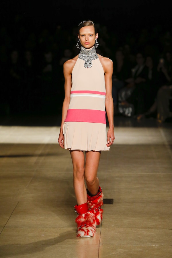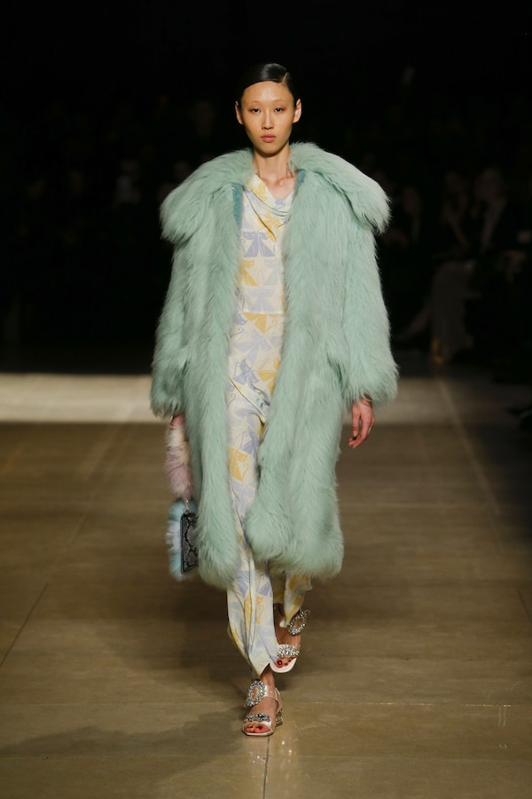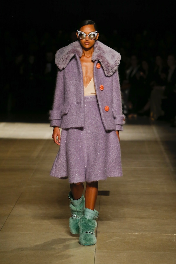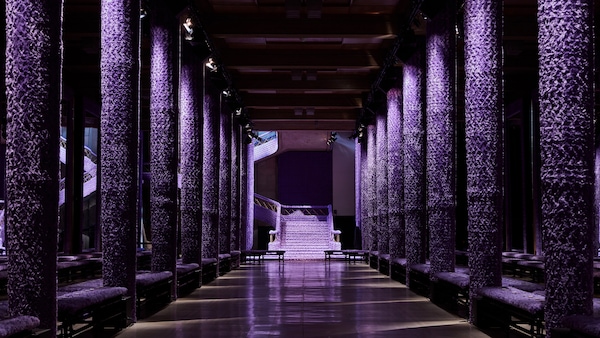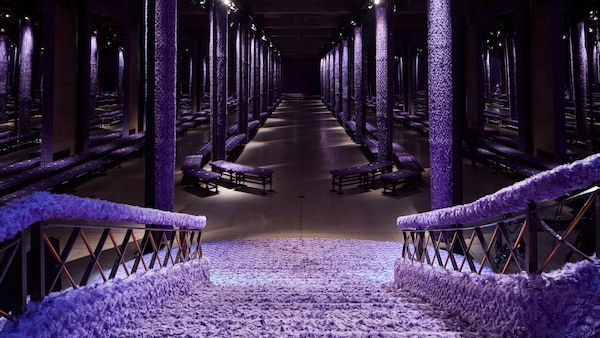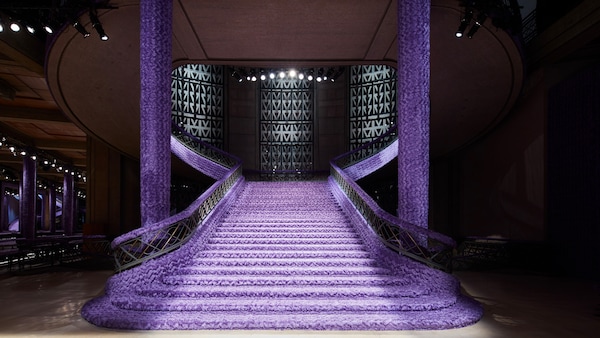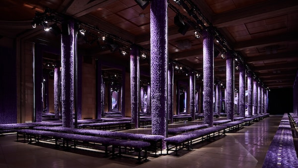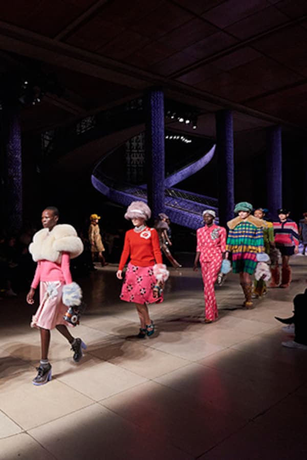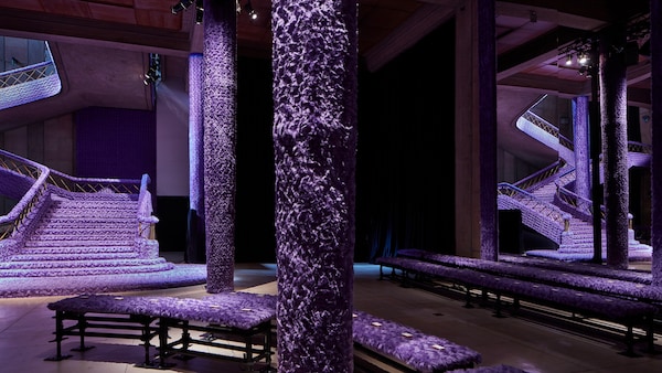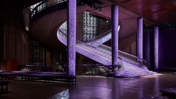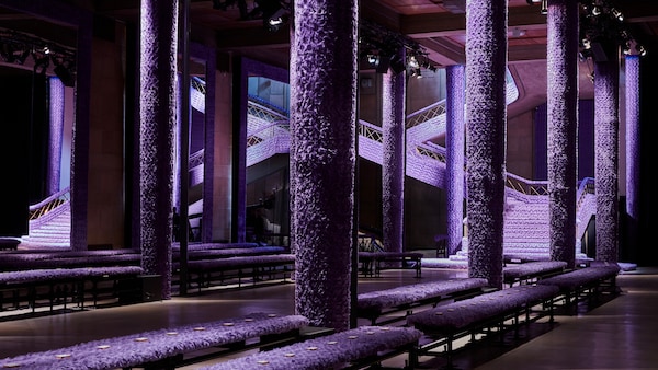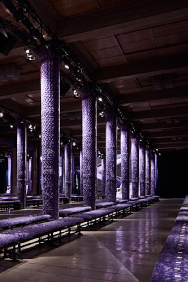 For the Fall/Winter 2017 Miu Miu fashion show, AMO wraps the main architectural elements of August Perret’s Palais d’Iéna in Paris in purple eco-fur as an antidote to the otherwise rigorous architecture.
