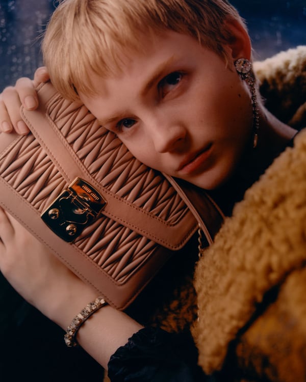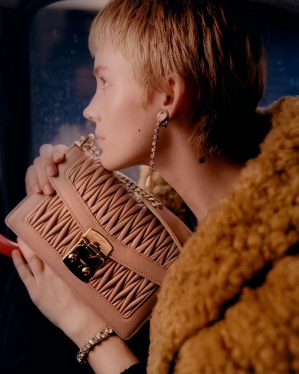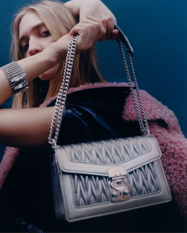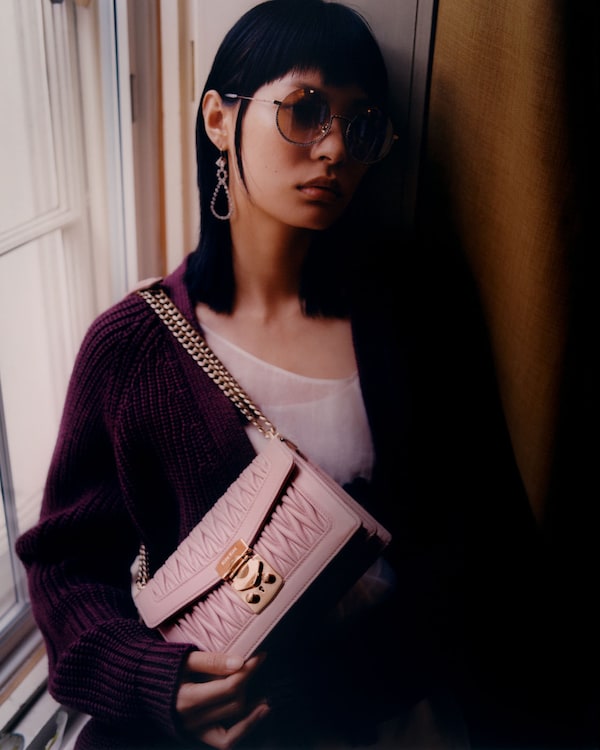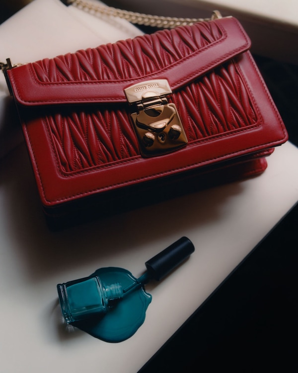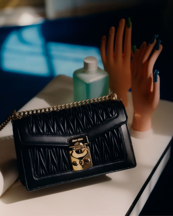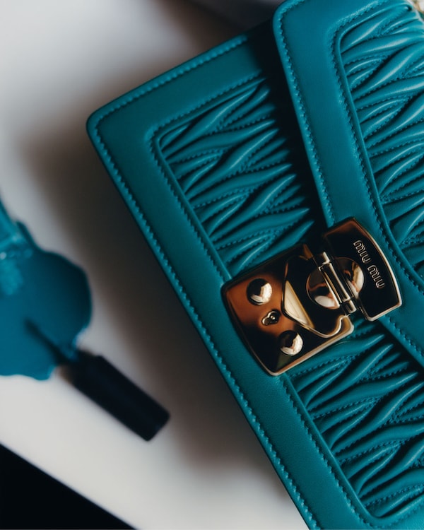 The Miu Confidential handbag is inspired by the intimacies only shared between a woman and her most treasured accessory: styled after a coffret, a precious locked chest or treasure casket for storing jewels, billets-doux and anything else close to the owner’s heart, the matelassé surface cossets and protects the contents, while the golden lock evokes security - the safe-keeping of precious confidences inside.