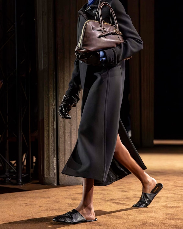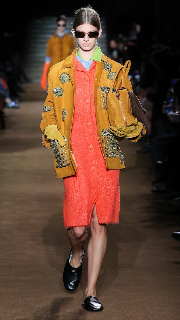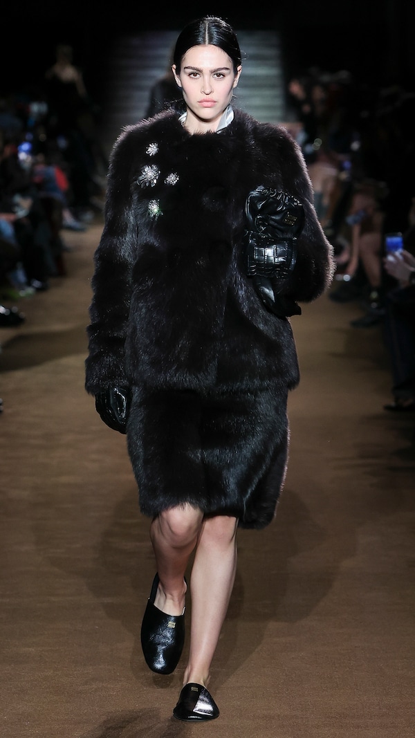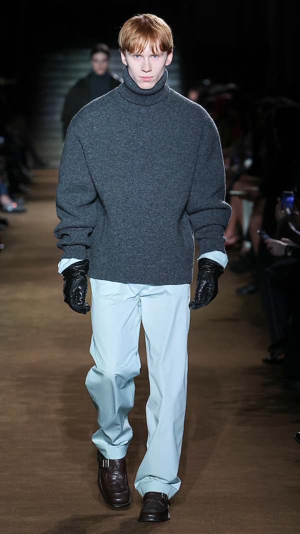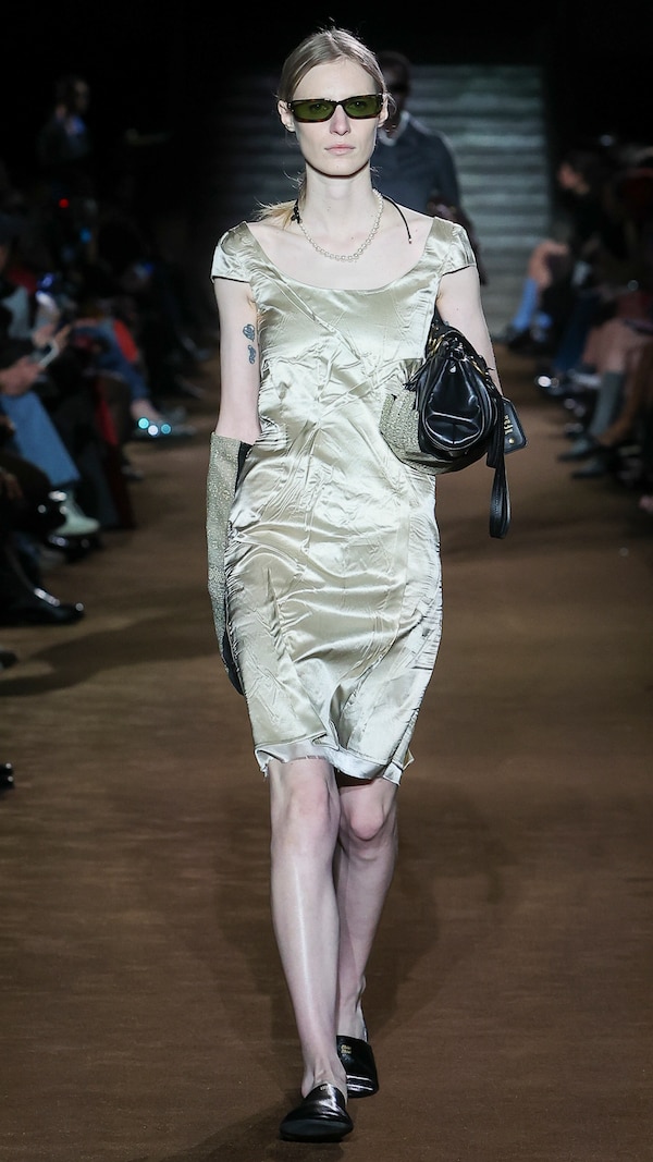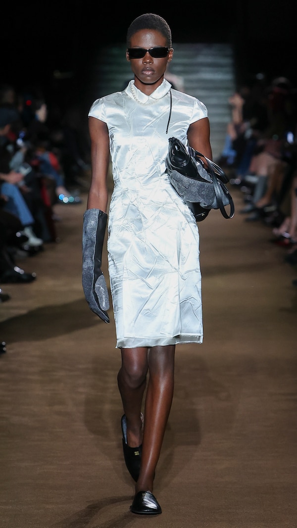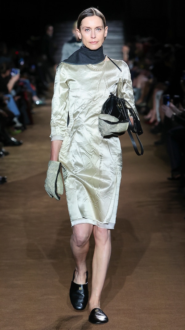 Those components of duality and recollection find counterparts in materials and construction. Bonding and fusing meld together different fabrics and combine disparate garments, sweaters and cardigans in silk and cashmere, poplin skirts with knit, while shearling is treated to mimic precious fur. Silk dresses are creased and molded to cotton jersey sheaths, volumes reduced but the impression of the original garment remaining, a trace of its antecedent.
