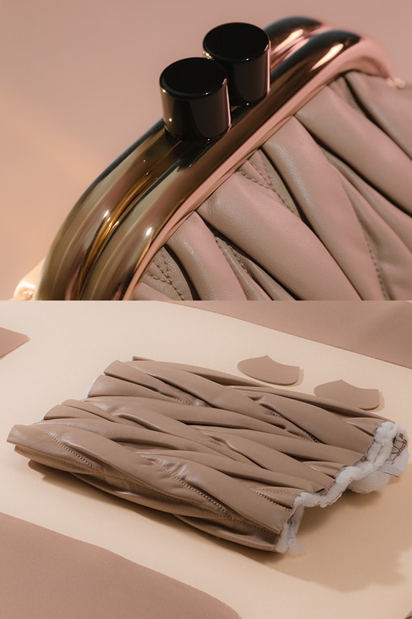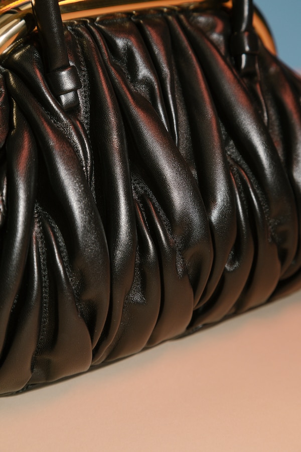The Miu Belle is further characterised by its polished metal frame and glossy black clasp which represent the perfect synthesis of glittering modernity and charmed nostalgia. Referencing jewellery, it is at once feminine and strong, its smooth, hard surface in direct contrast to the pleated skin.