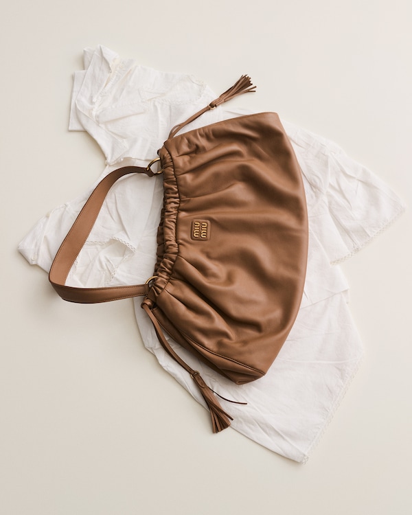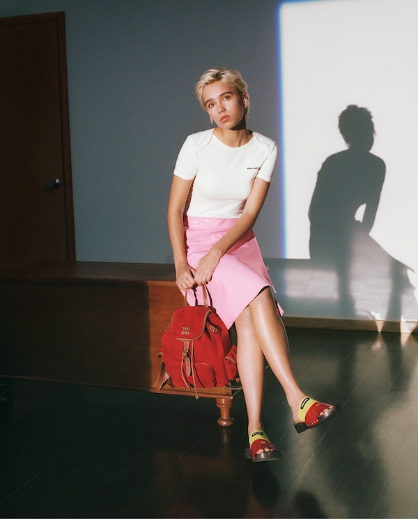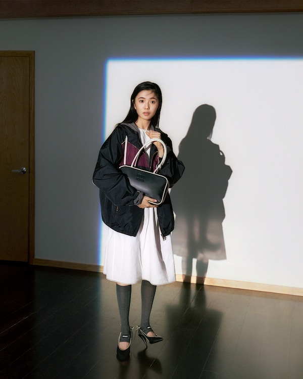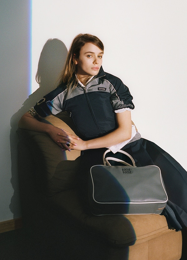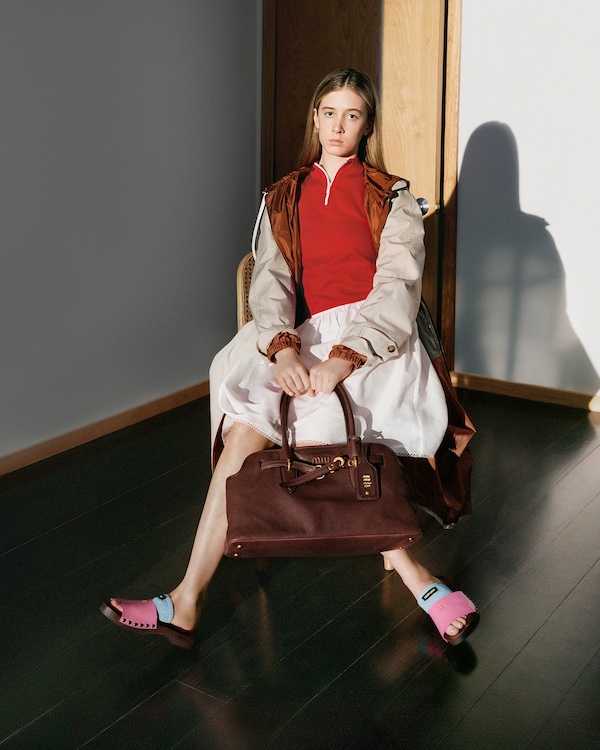 Donde hay luz, hay sombras. Donde hay transparencia, hay interpretación: las alternancias en la creación y en la percepción introducen capas de significado y profundidad. Prendas que parecen de nylon, en realidad se han confeccionado con lujosa seda técnica. Los hiperfemeninos degradados florales y los rosas pastel entran en contraste con sobrecamisas deportivas y pantalones de inspiración sastre masculina en gris uniforme y negro, y zuecos con suelas de madera tachonada. El bolso Aventure, con su elegancia atemporal, y el cautivador Arcadie se compensan con la pisada atrevida de las nuevas zapatillas del desfile o se realzan con las Mary Janes de tacón de bloque. Miu Miu reinventa constantemente sus piezas icónicas, reinterpretándolas.