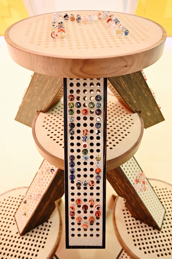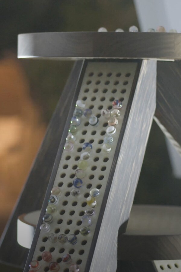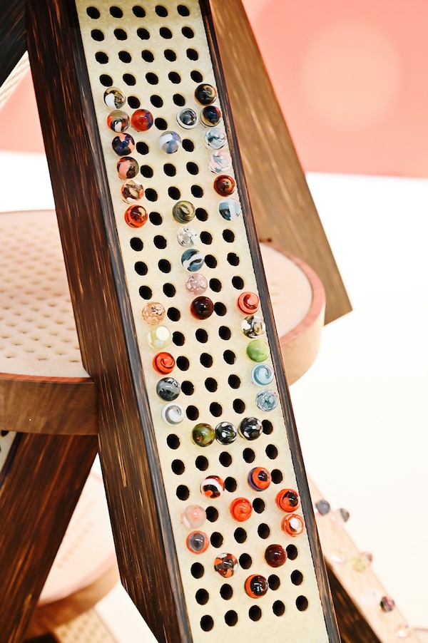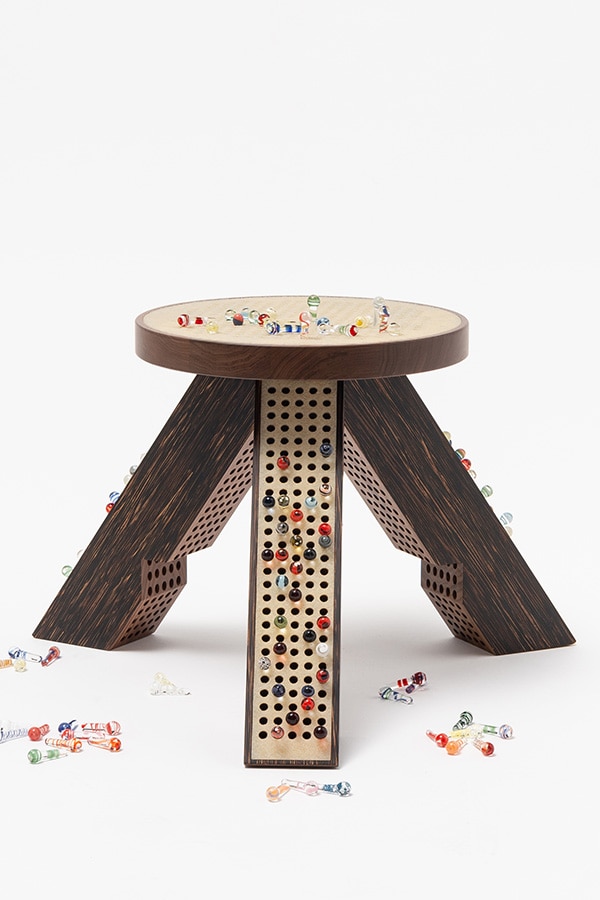 Echoing the playful interactive process of a game that uses logic, the different coloured matchsticks may be moved around to create original patterns, further customising the design, and ensuring that no two Miu Miu M/Marbles Stools are ever the same.