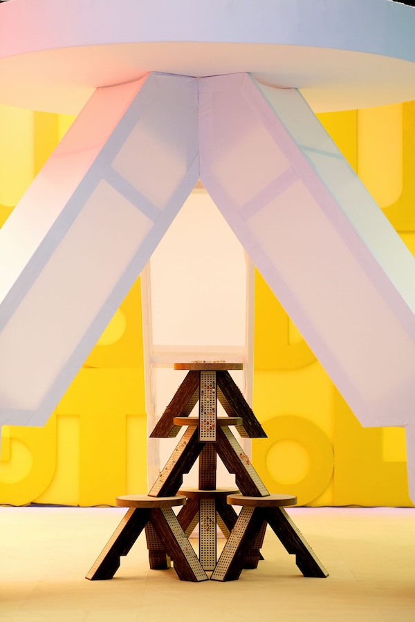 Playing with the language of fashion, rubber and glass evoke accessories. Rubber — a material most commonly found on the soles of shoes — is used to stencil the form. Glass matchsticks finish and personalise the design, reflecting fashion’s artisanal nature, as each matchstick is made by hand. The glistening objects contrast with the matt base of the stool, injecting colour and lightness.