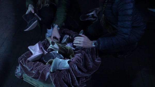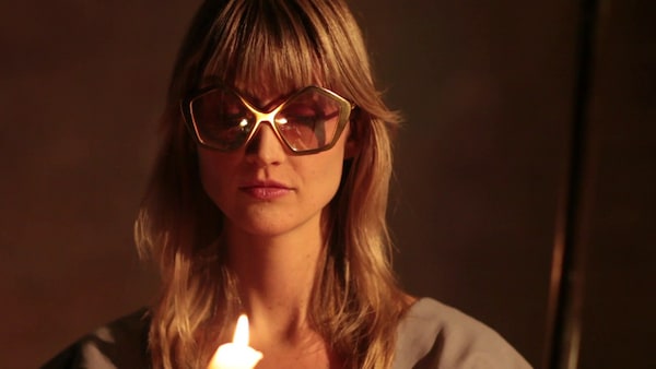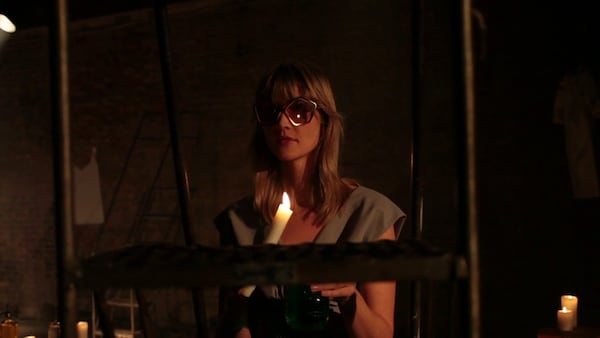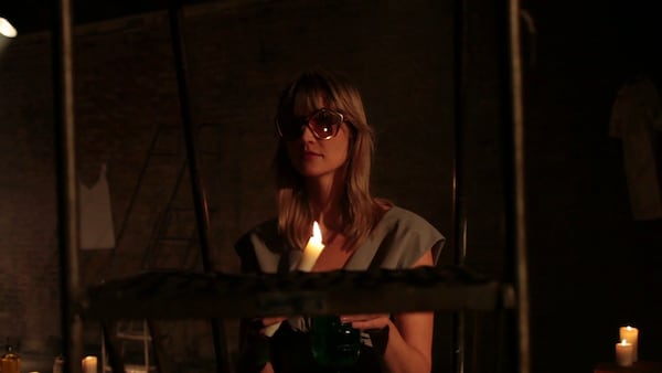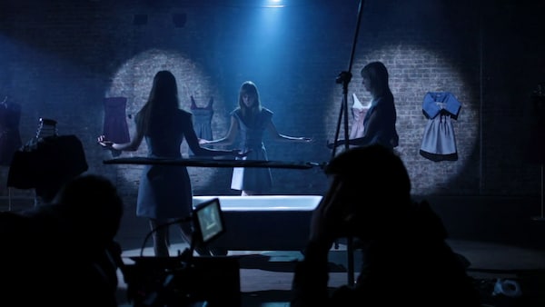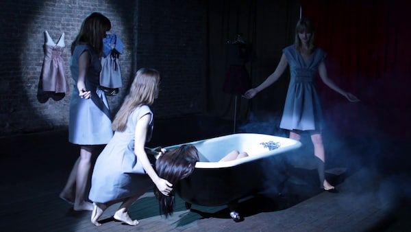 A coven of elegant witches attends a bubbling cauldron, their shadowy cavern hung with the ghosts of dresses. Maya Sansa is undressed and led to a bath, and her finger pricked to draw blood. The witches – played by Heather D’Angelo, Erika Forster and Annie Hart of Au Revoir Simone – circle, chanting in strange tongues. As the smoke clears we see Maya Sansa has made the ultimate sacrifice, transforming herself into the object of her desire – a beautiful blood red dress