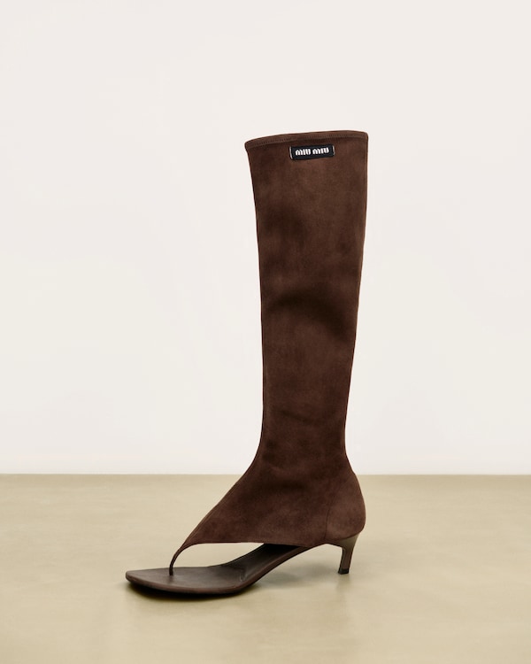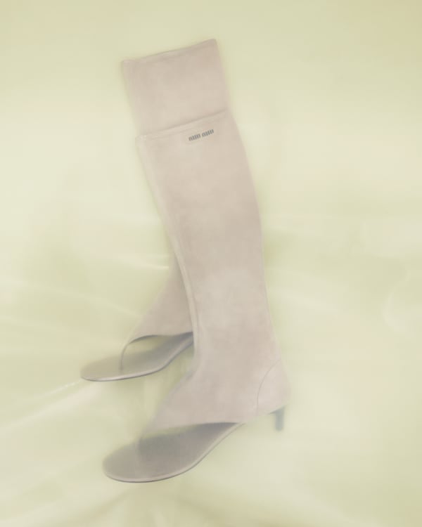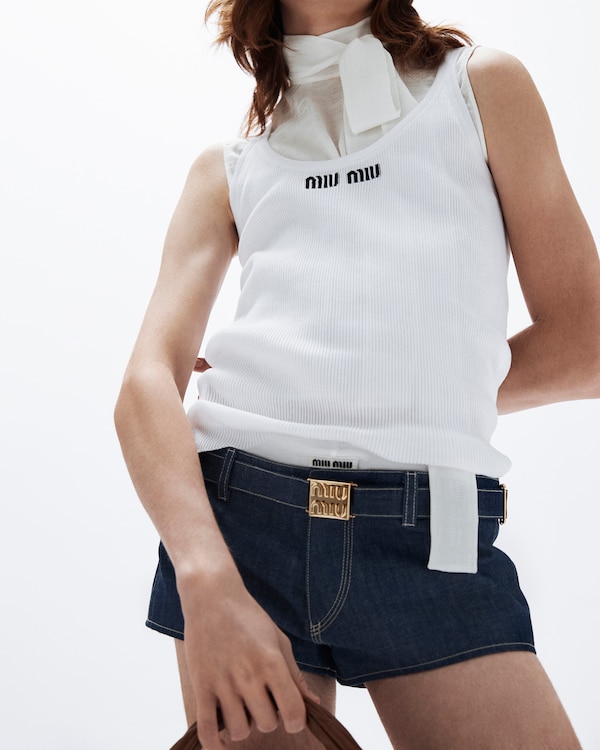 Raccourcis, les chemises, les vestes et les micro-jupes et micro-shorts jouent avec les proportions. Les robes et vestes safari et les jupes fendues, déclinées dans les couleurs du désert, sont associées à des débardeurs simples en coton, brodés du logo Miu Miu. Les pièces en maille à rayures et en denim brut fascinent par leur impertinence.