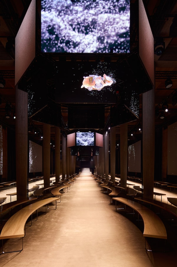 Pendant le défilé, la collection de courts-métrages Miu Miu a été projetée dans son intégralité dans le parlement du Palais d’Iéna. L’espace était simultanément animé par des performances continues.