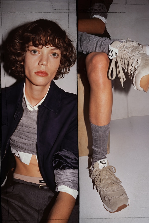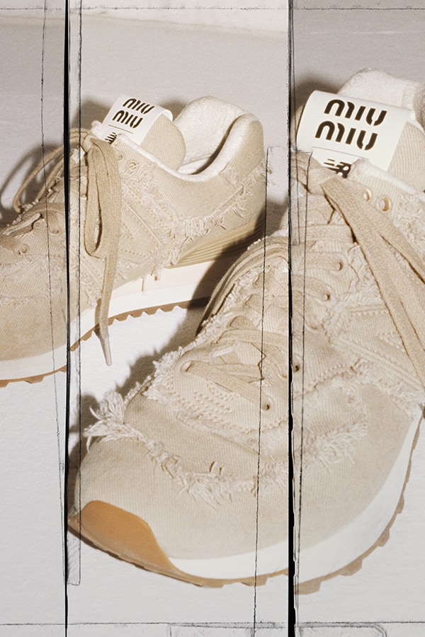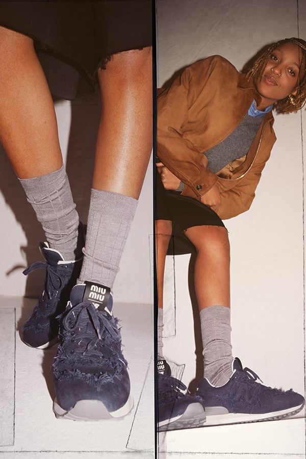 Pour la collection Miu Miu Printemps/Été 2022, Miuccia Prada retravaille la basket New Balance 574 des années 1980 dans le cadre d’une collaboration unique avec la marque américaine incontournable.