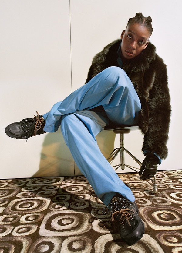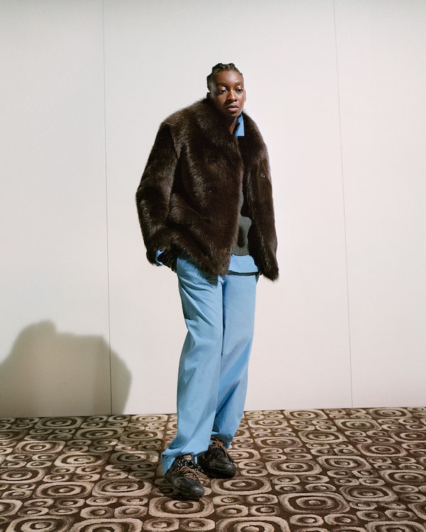 A white backdrop and whirlpool carpet, a curation of highly distinctive chairs. These both ground and disrupt, echoing the fusion of time, place, memory, function and fashion seen in the collection itself. A coat in glossy shearling masquerading as mink is worn with a chemisier dress or cropped trucker jacket and skinny jeans; shrunken tailoring with chic leather gloves and an elegant string of pearls; a plush, oversize fleece jacket with a narrow flannel tube skirt; a little black dress, deconstructed, with sharply pointed mary-jane pumps; a sporty puffer with buttoned up tailoring.