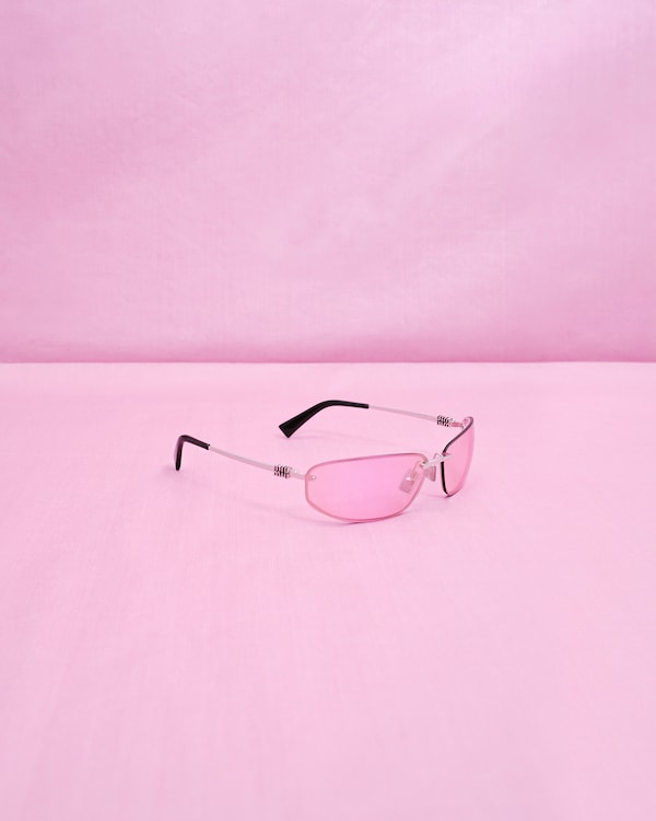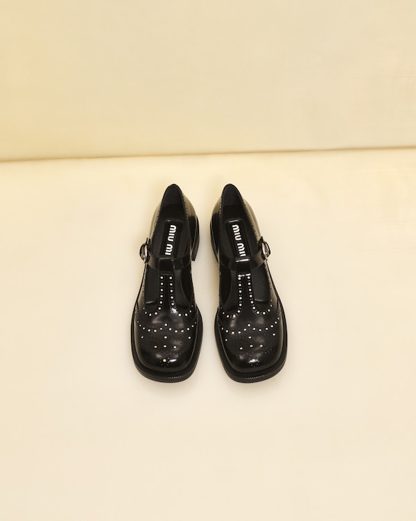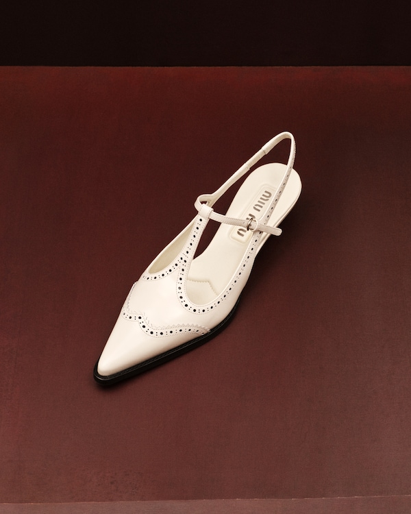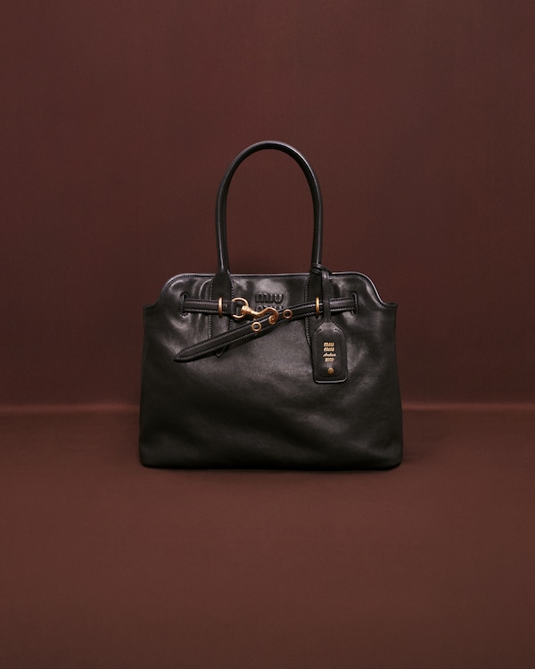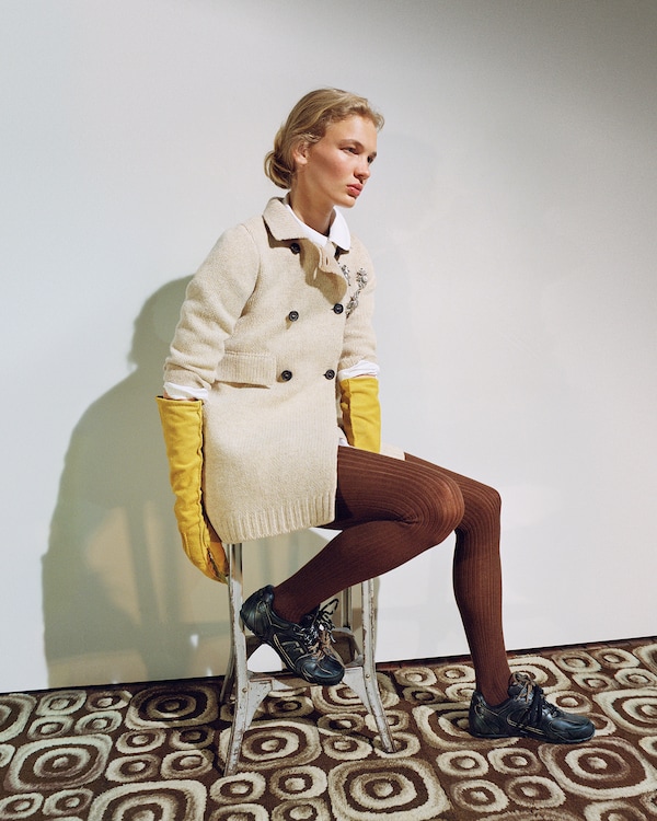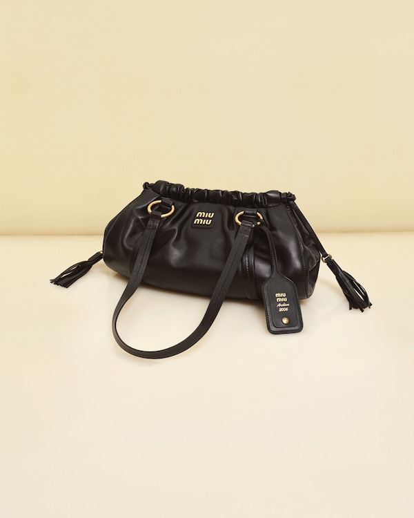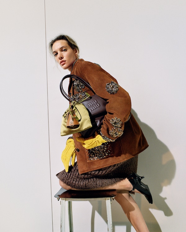 Up-ending preconceptions of night-time dressing, Miu Miu pyjamas in cotton poplin are designed for day. Accessories underscore such unlikely juxtapositions: masculine shoes are contrasted with New Balance x Miu Miu sneakers in aged leather, slippers in softest calf, the eternally elegant Aventure bag and the irreverent Joie bag, both archival designs re-defined in soft, shiny nappa with gold metal hardware and elongated straps.