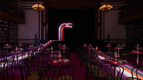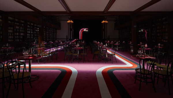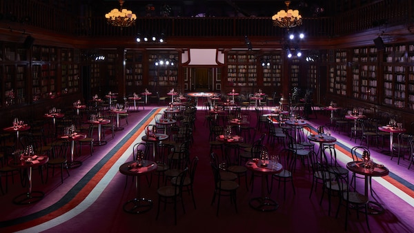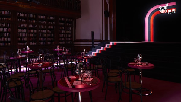 For Miu Miu Club 2017, the space was customized for innovation over incubation. AMO transformed the library into a car-themed lounge that reconciles the progressive spirit of the club with the grandeur of the late Rococo. For the presentation of the collection, the models, illuminated by theatrical follow spots, traced a graphic circuit that linked the stage and the lounge. True to the Miu Miu tradition, glittering young stars composed individual scenes, collaging sounds and styles over an atmosphere rich with creative history, while guests frequented the bar, dining room, and spectacular terrace that overlooked the luminous city.