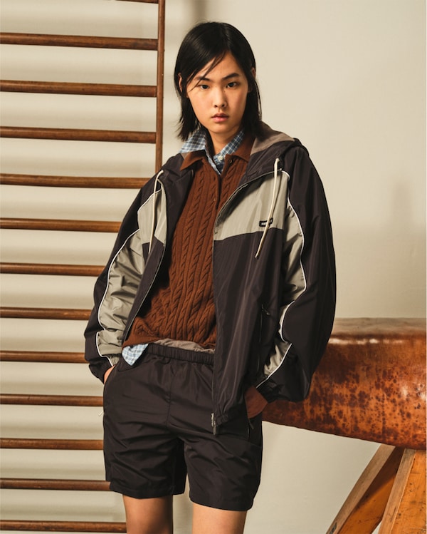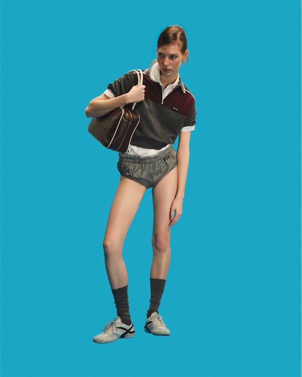 Signature blousons in technical silk, kid mohair jackets, pants, skirts and shorts, active knitwear and polos in cotton silk come in a color palette dominated by red, white, blue, brown, grey and in silhouettes contrasting the oversized and the abbreviated, today a proposal at the heart of the Miu Miu name.