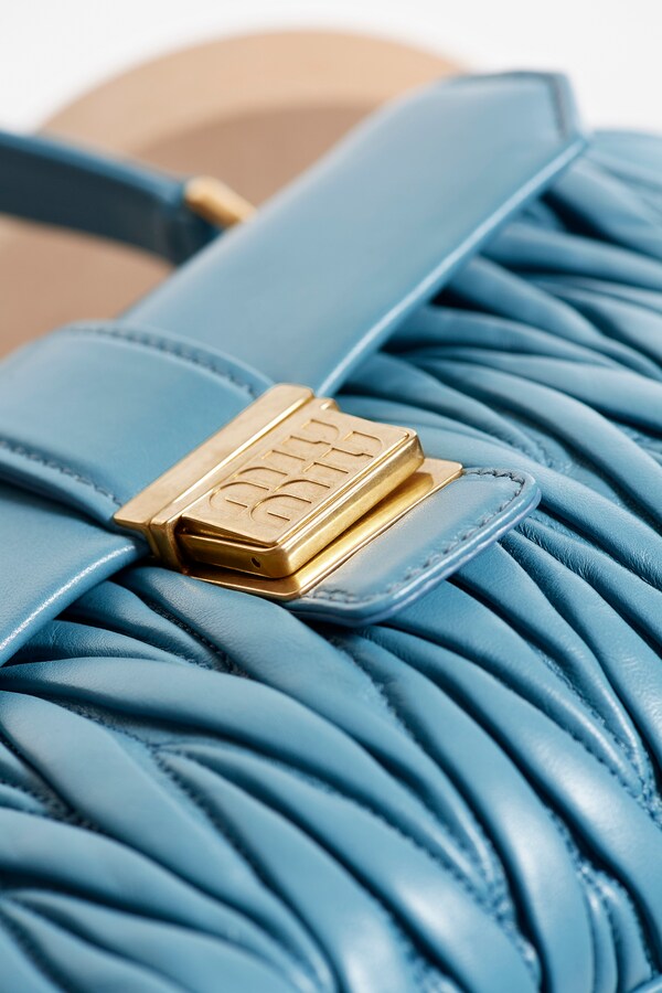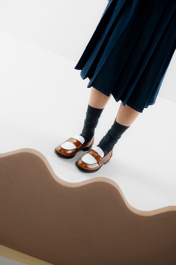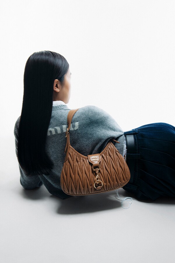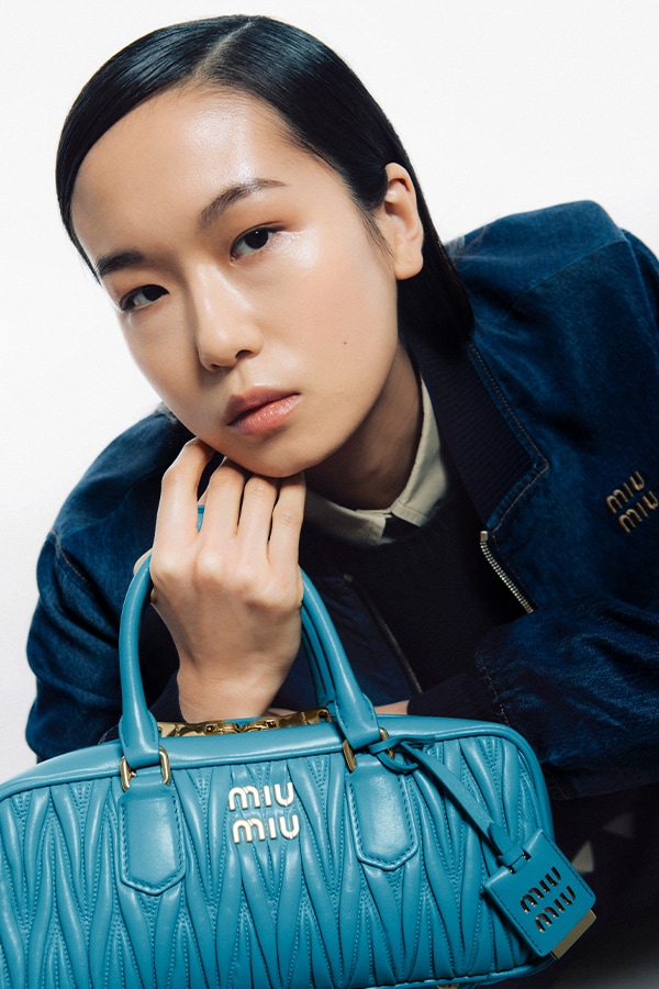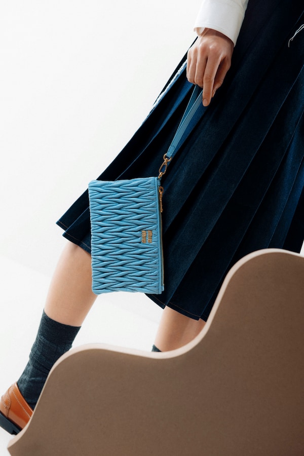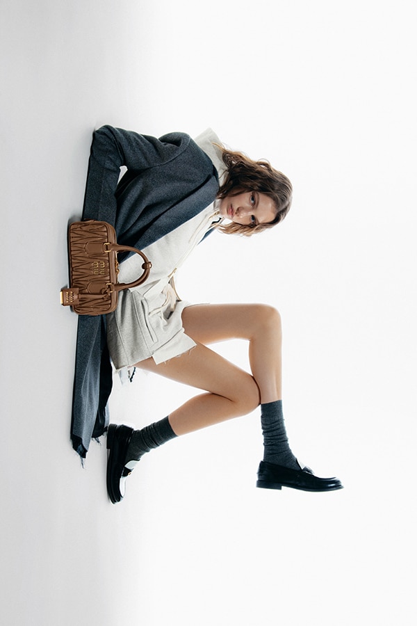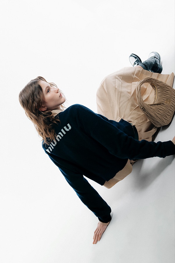 The Collection includes brand's iconic Matalassé leather, new colors and new materials for the iconic penny loafers, a line-up of basic clothing such as light poplin shirts, pleated skirts and a high-quality cashmere spring coat. In addition Miu Miu features sophisticated sporty looks using denim, technical silk and jersey from spring/summer 2023 runway.