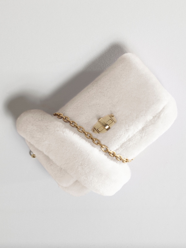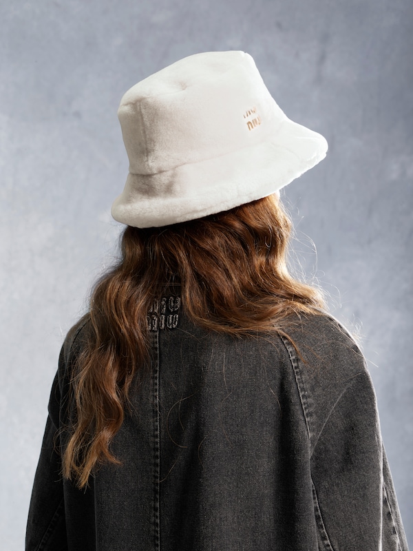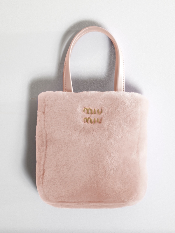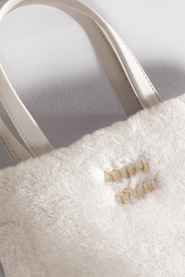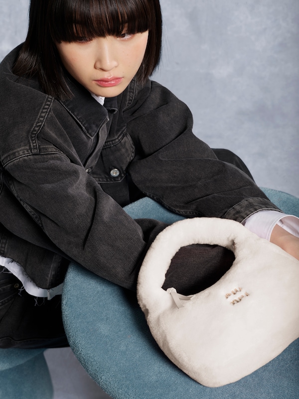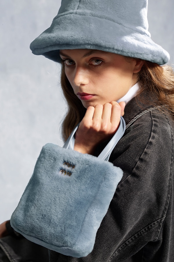 The collection includes iconic “Miu Wander” bags in soft sheep fur, a tote bag, top handle bags, shoulder bags, as well as small leather goods, bucket hats, ear mufflers, hair accessories, smart phone cases and key rings, in a color palette of white, ecru, sky blue, pastel green and orchid pink.