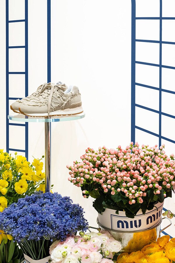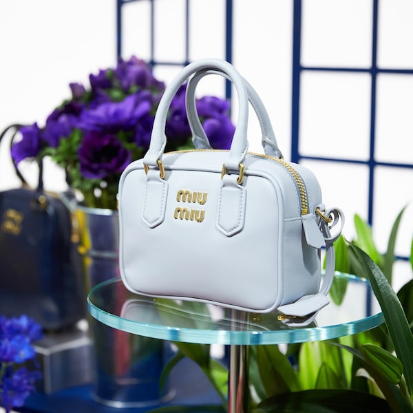 The product offer focuses on rediscovering the value of classic styles, especially through Iconic matelassé and madras leather designs – bags, purses, credit card holders and more – which come in a fondant palette and in classic beige, black, white and navy. In addition, Miu Miu logo all over bags and small leather goods (protagonist of the last fashion show) presented in new color shades. Exclusive to the Secret Garden store are leather goods inlaid with stylised flowers and a preview of the New Balance x Miu Miu sneaker collaboration, first seen on the Spring/Summer 2022 Paris runway in Paris. The selection includes also vichy checks and polka dots signature faille bags, small accessories, bucket hats and baseball caps in sunny shades.