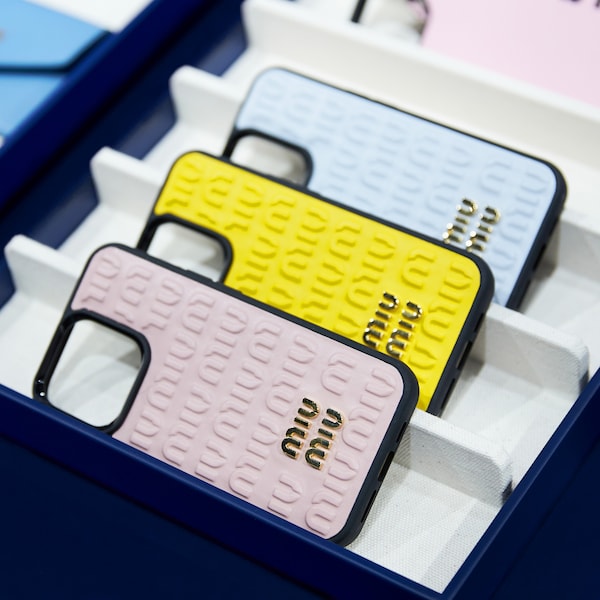 Miu Miu branded water bottles, iPhone cases, key fobs, alice bands and scrunchies are all also available as are jewelled hair combs, pins and polished brass charms. The effect is clear, bright and optimistic throughout.