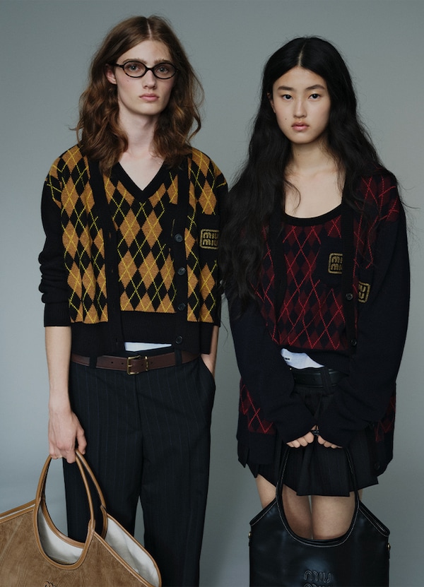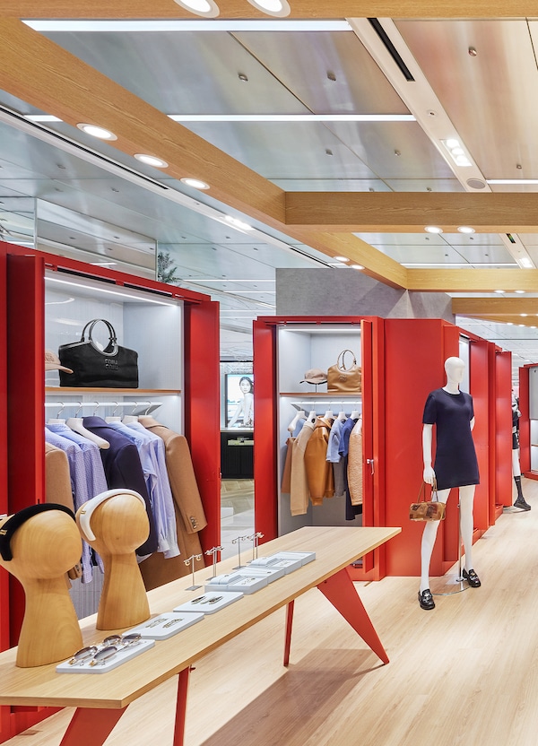 레드 컬러의 메탈 소재 옷장과 우드 선반으로 구성된 이 팝업 공간에서는 프레피 무드에서 영감을 받은 클래식한 유니폼 아이템과 최신 컬렉션을 만날 수 있습니다. 블랙, 그레이, 네이비, 브라운과 같은 베이직한 컬러의 타임리스 아이템과 함께 미우미우의 대표적인 패턴 중 하나인 아가일과 깅엄 체크로 장식된 의류도 만날 수 있습니다.