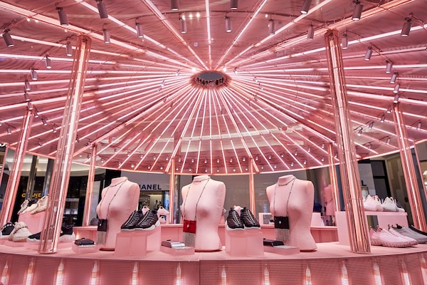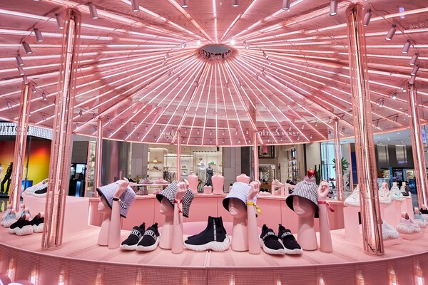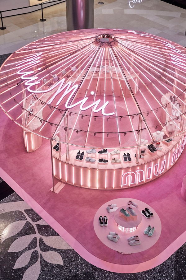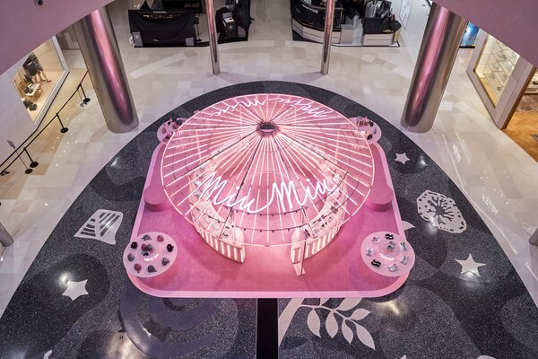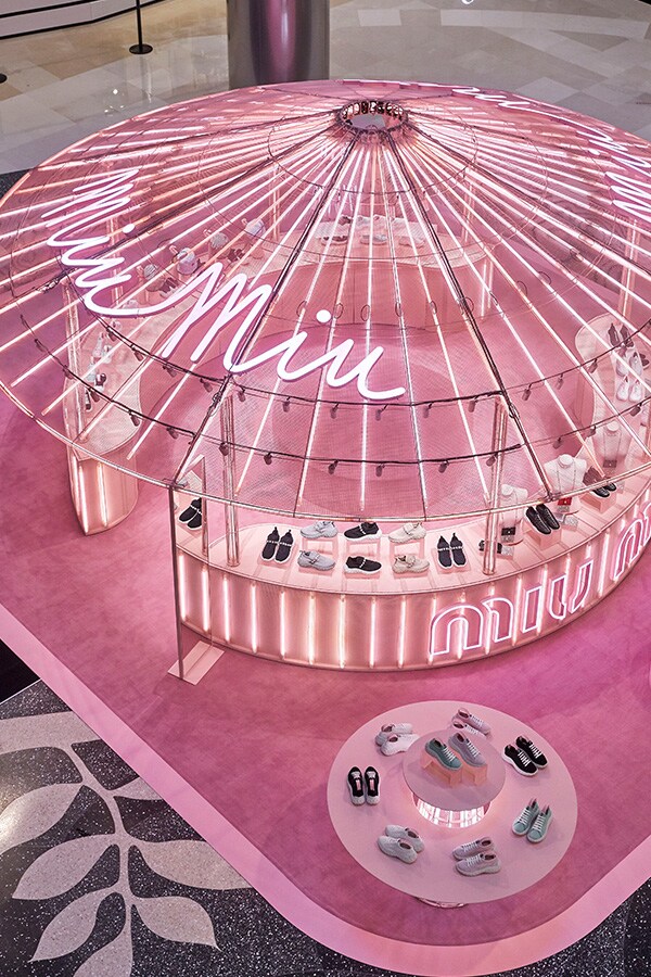 미우 노바 팝업 스토어의 디자인은 미우미우의 핵심인 진정한 여성미와 자유로운 정신을 반영합니다. 부드러운 형태와 둥근 볼륨이 특징인 메탈 가제보와 원형 벤치, 푸프 쿠션, 카펫, 튜브 모양 조명, 네온 로고 모두 슈가핑크로 디자인되어 있습니다. 슈가핑크는 미우미우에 중심이 되는 컬러일 뿐만 아니라 흑백 배경 속 마치 주인공처럼 제품 최고의 모습을 보여줍니다.
