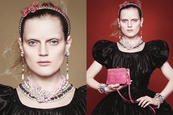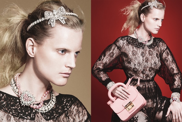Transparent dresses in intricate lace with trompe l’oeil collars, in cady armuré or in taffeta with balloon sleeves and skirts, are enriched with jewellery: brass chokers and earrings with multi coloured crystals as well as necklaces and bracelets with pearl cabochons and jewelled clasps.