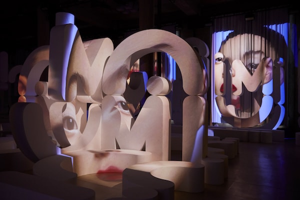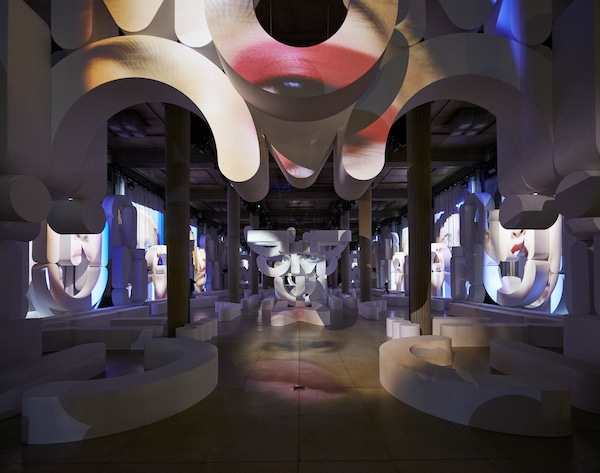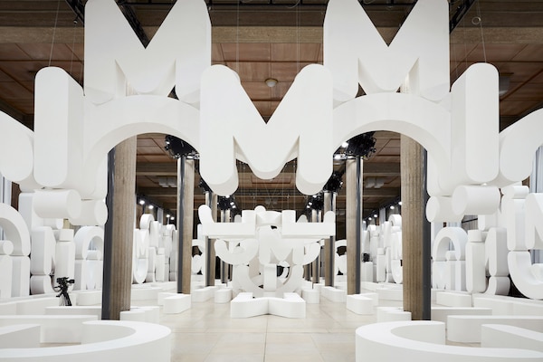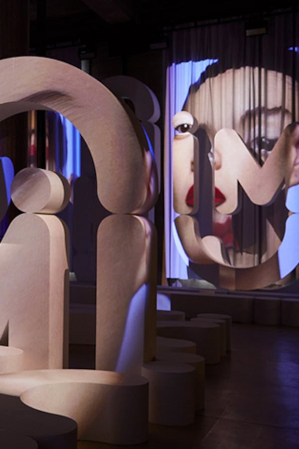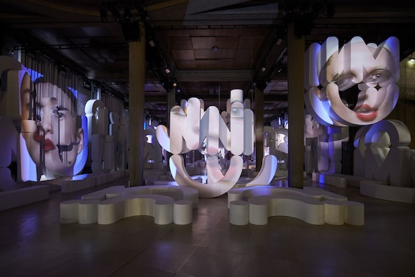 Les structures qui s’en dégagent transforment le Palais d’Iéna en un espace blanc organique, chaotique et géométrique plongé dans l’obscurité, tandis que des vidéos sont projetées un peu partout, lui donnant l’apparence d’un écran géant déconstruit pour les portraits vidéo serrés et colorés de femmes inventées, qu’on entend prononcer « M », « I » et « U ».