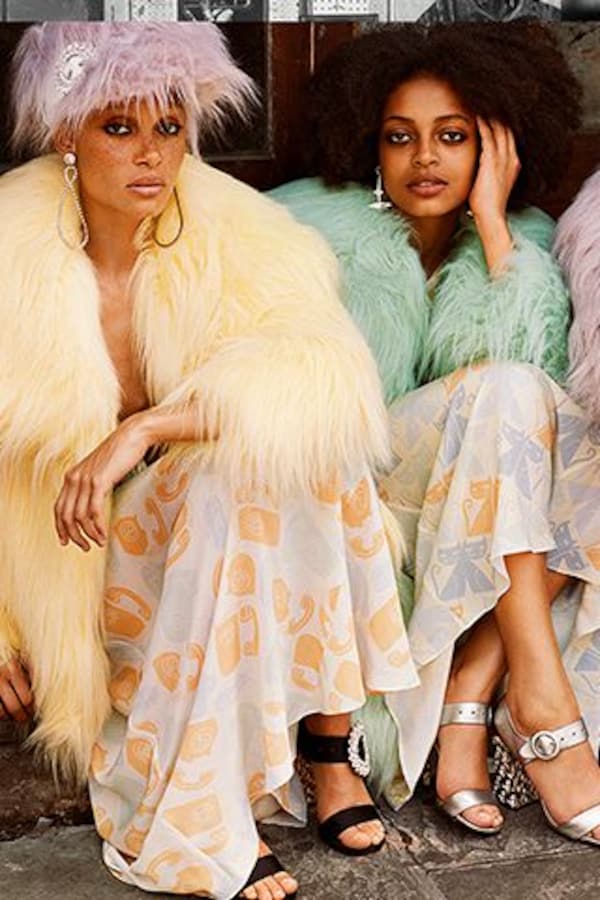 Diverse references drawn from a multiplicity of pasts represent splintered images of glamour: brightly-colored faux furs and translucent plastics sheath feathered drop-waist dresses, superimposing contemporary shapes and materials onto old-timey sensibilities.