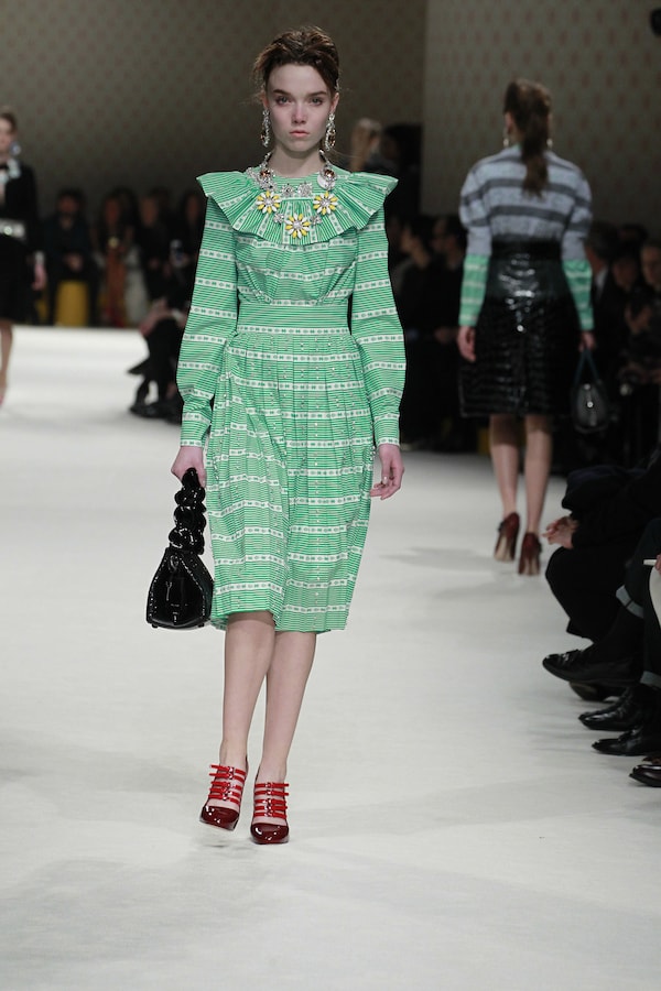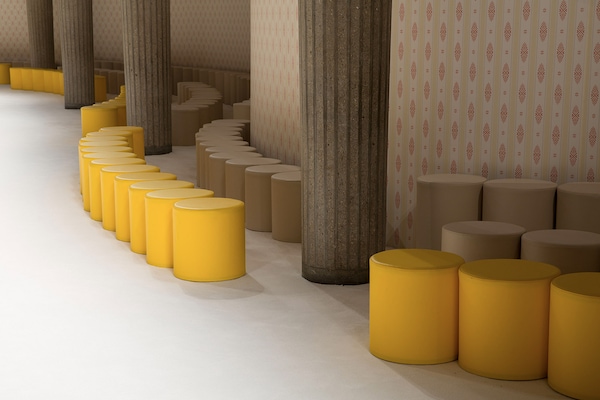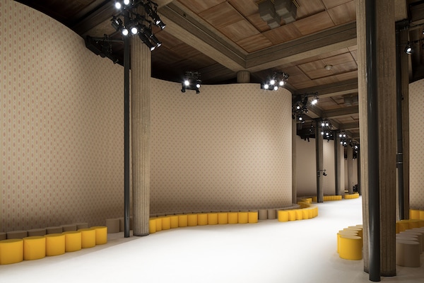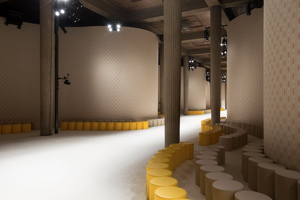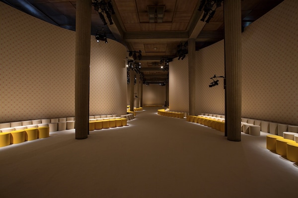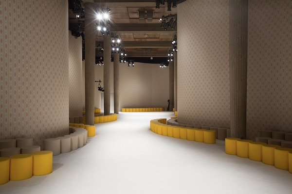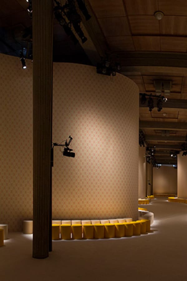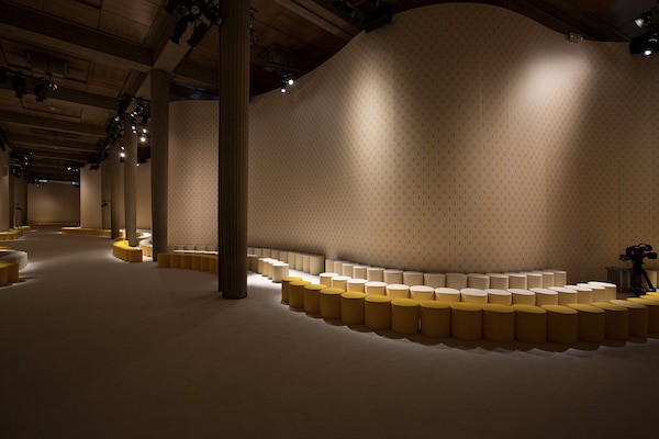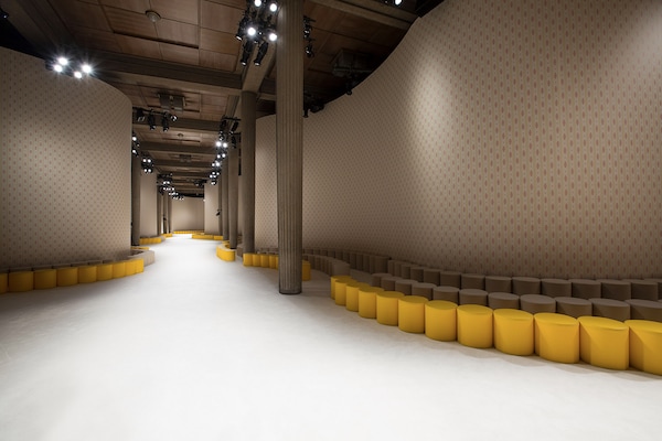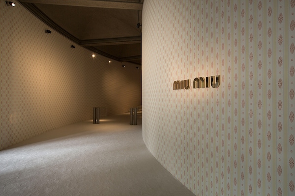 A continuous invasive shape, the installation guides the guests from the entrance of the Palais d’Iena seamlessly into the show space. Miumiu wallpaper and white carpet were used to soften the authority of the volume and give a domestic effect.