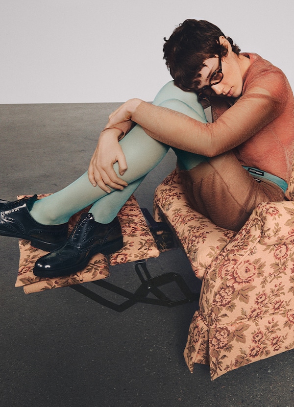 This special launch is celebrated by a still and moving image campaign using a timelessly beautiful gentleman’s armchair, richly upholstered in archive Miu Miu fabric, as a stage. Multiple positions and gestures are adopted by models wearing the Miu Miu ready-to-wear Collection with the Church’s X Miu Miu brogue and double monk strap shoes. The comfort of the armchair and languor of the poses are in direct contrast to the polite and conventional perception of the designs.