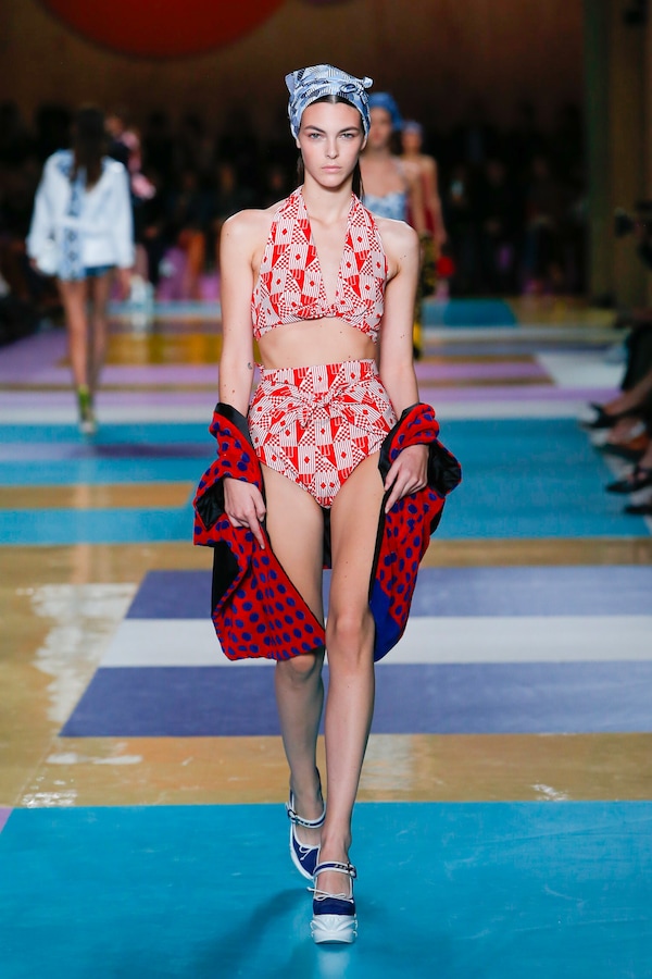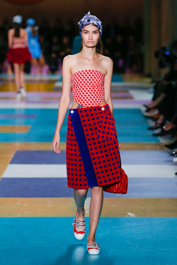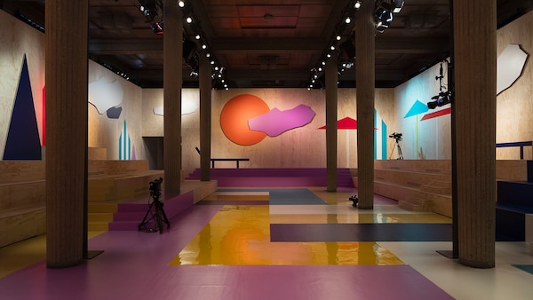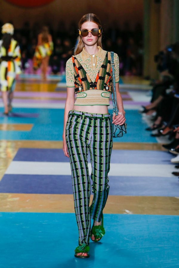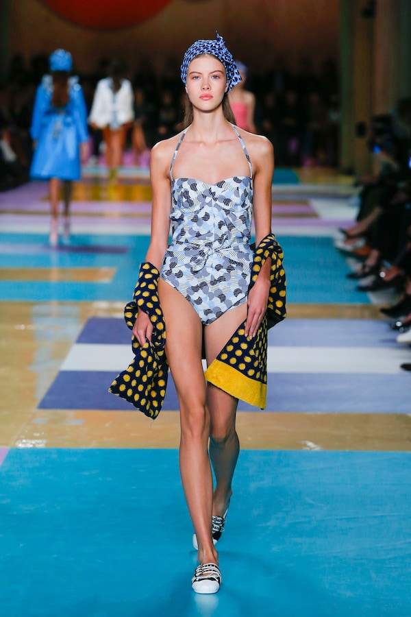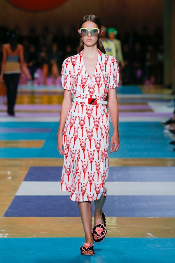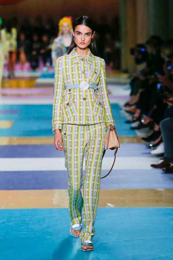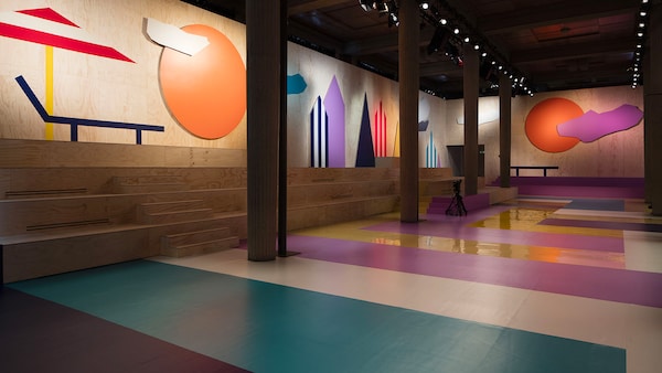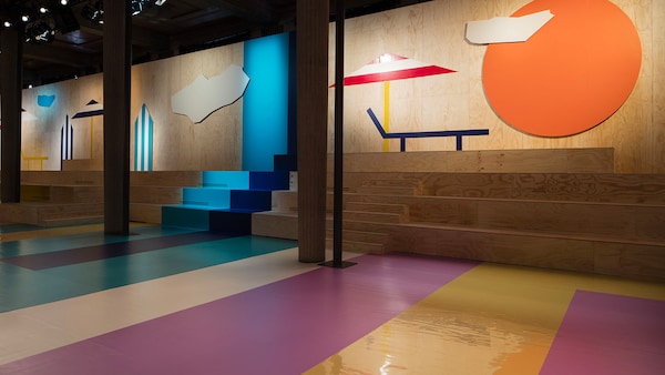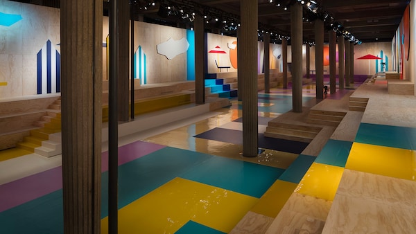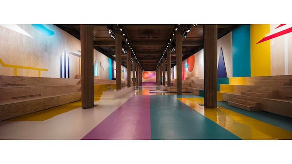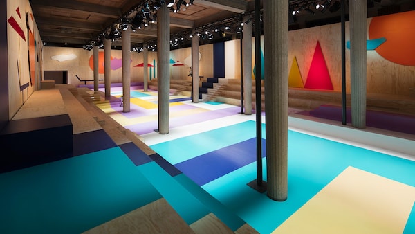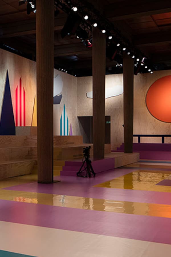The catwalk is contained inside a plywood box, constructed within the Salle Hypostyle. The audience sits on graduated platforms that emerge from the wooden background, set on either side of the linear runway. An interweaving pattern made of matte and shiny PVC covers the floor and catwalk, in places continuing up the tribunes and walls. A series of graphic illustrations recreates naive and colorful landscapes, reminiscent of summer settings.