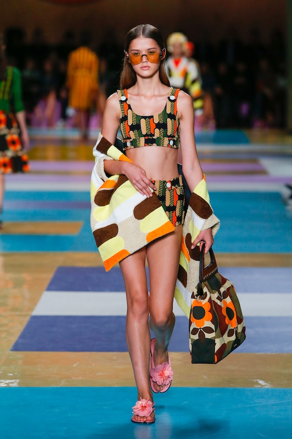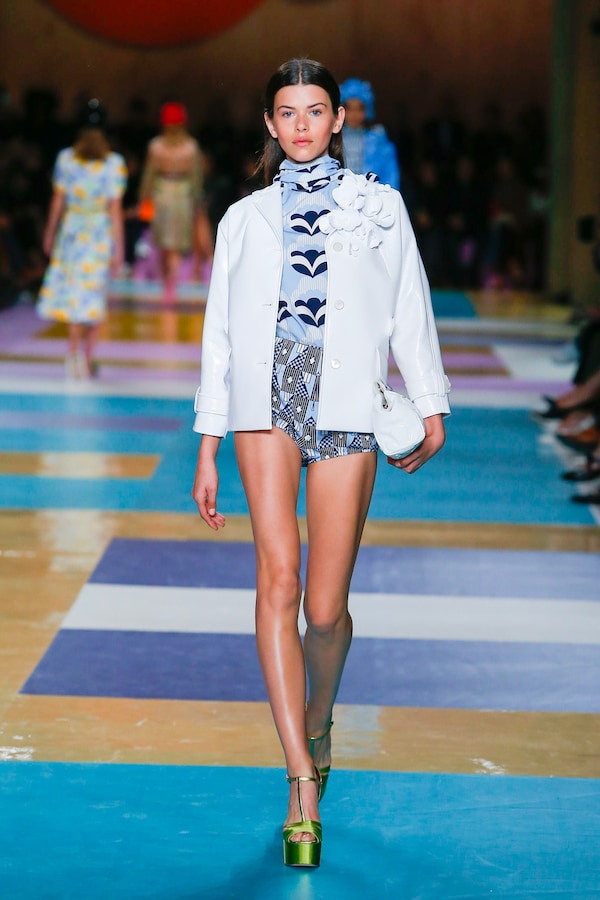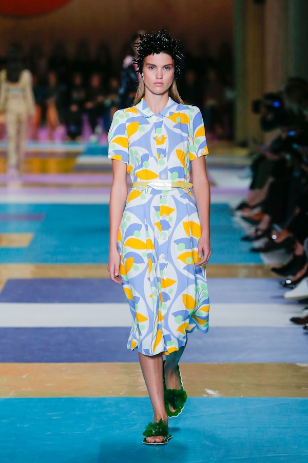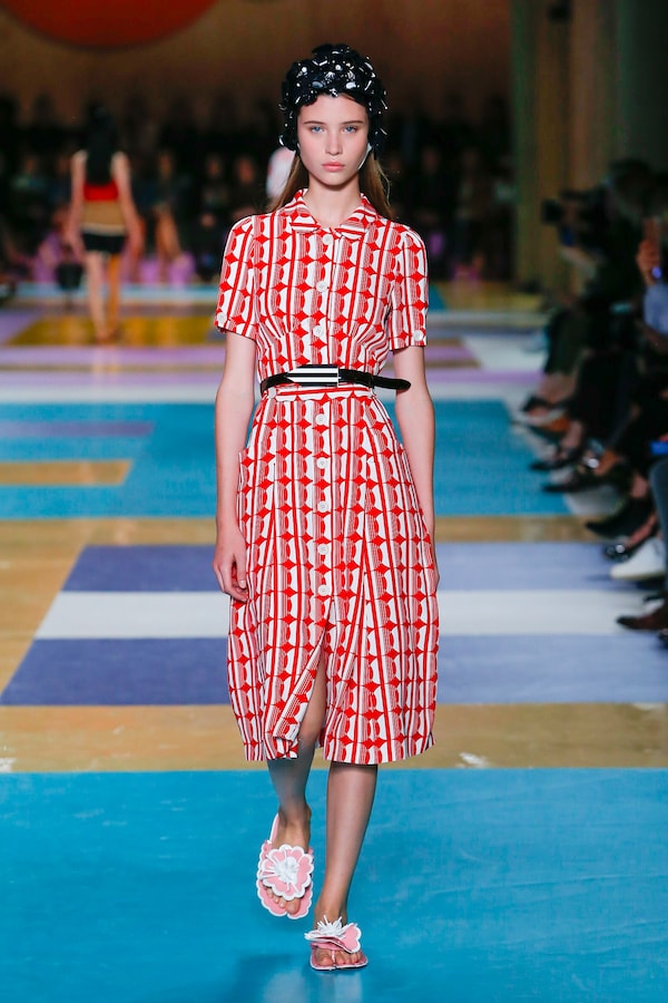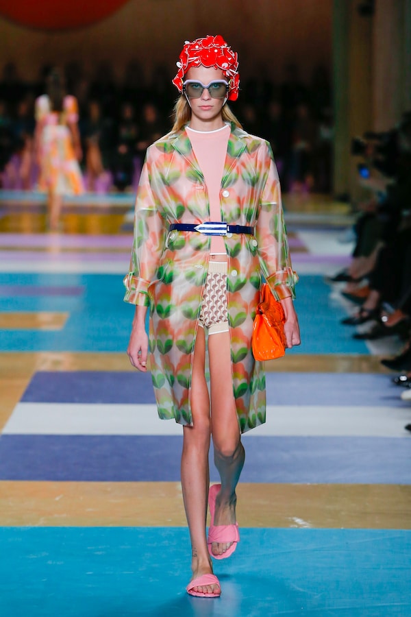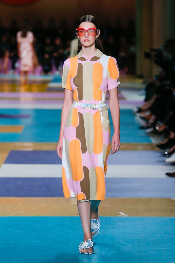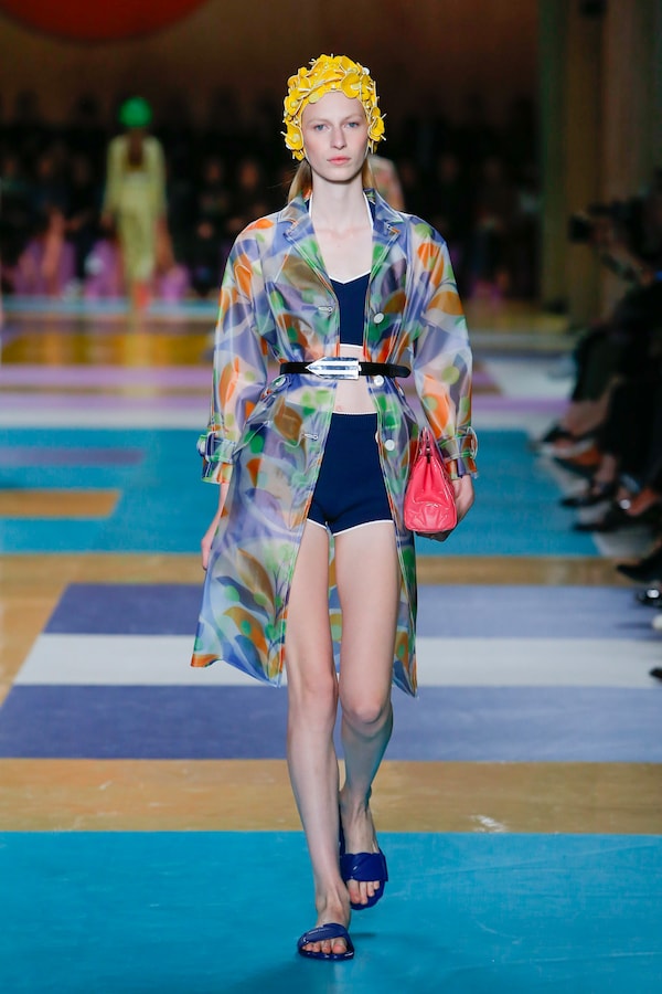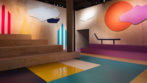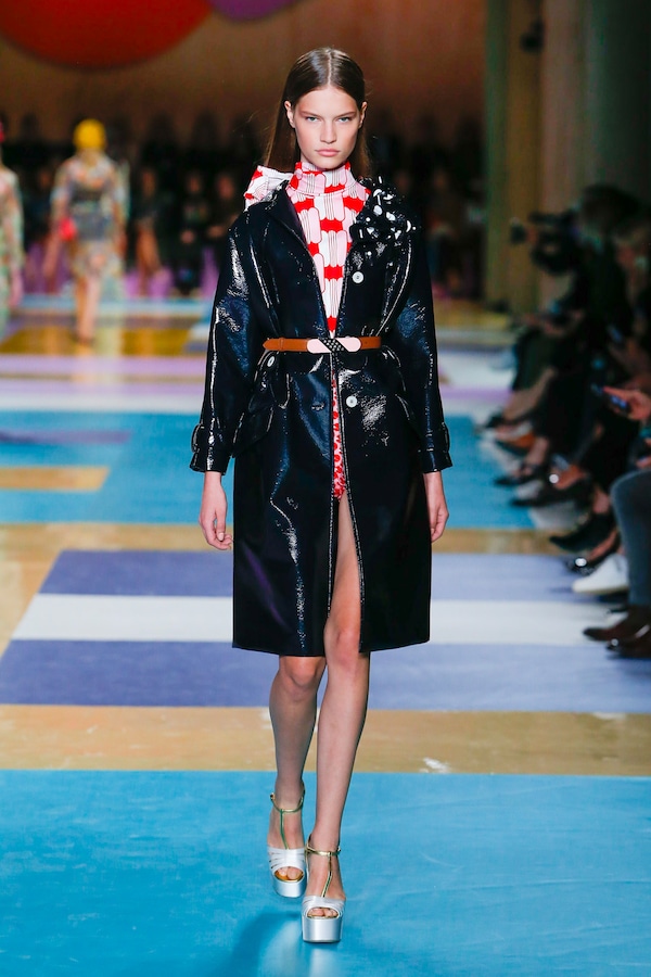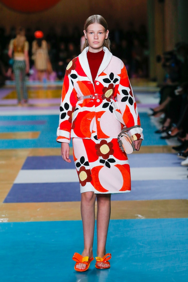 The catwalk is contained inside a plywood box, constructed within the Salle Hypostyle. The audience sits on graduated platforms that emerge from the wooden background, set on either side of the linear runway. An interweaving pattern made of matte and shiny PVC covers the floor and catwalk, in places continuing up the tribunes and walls. A series of graphic illustrations recreates naive and colorful landscapes, reminiscent of summer settings.