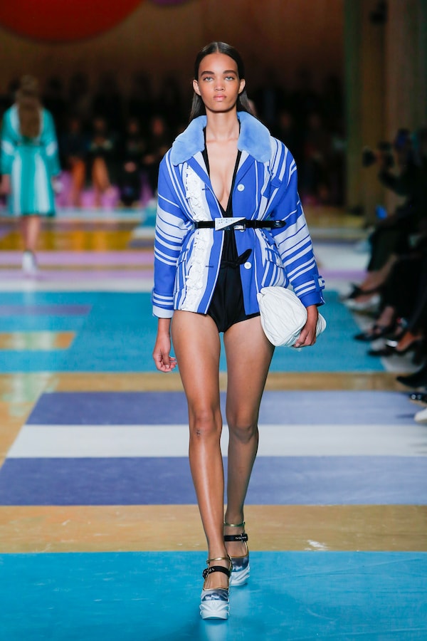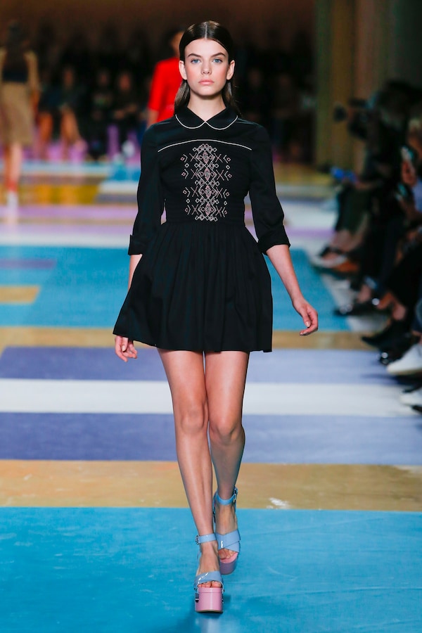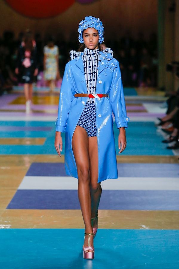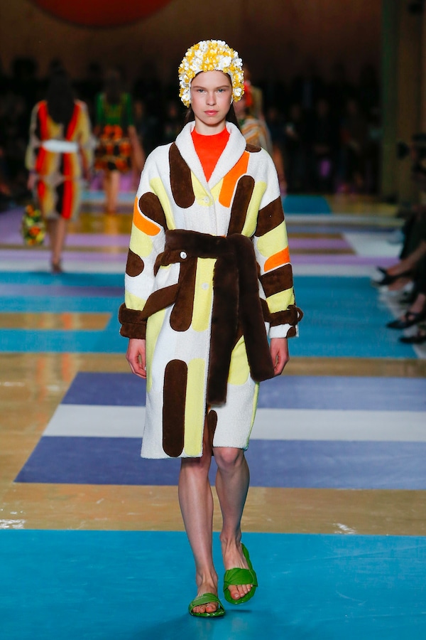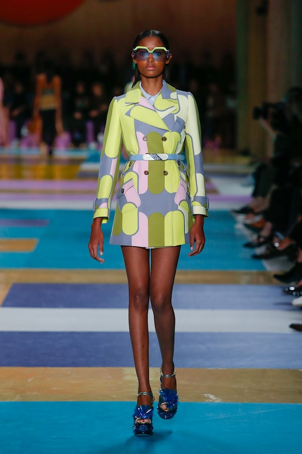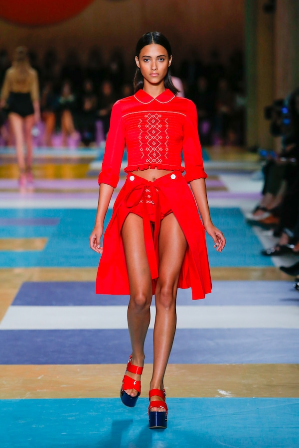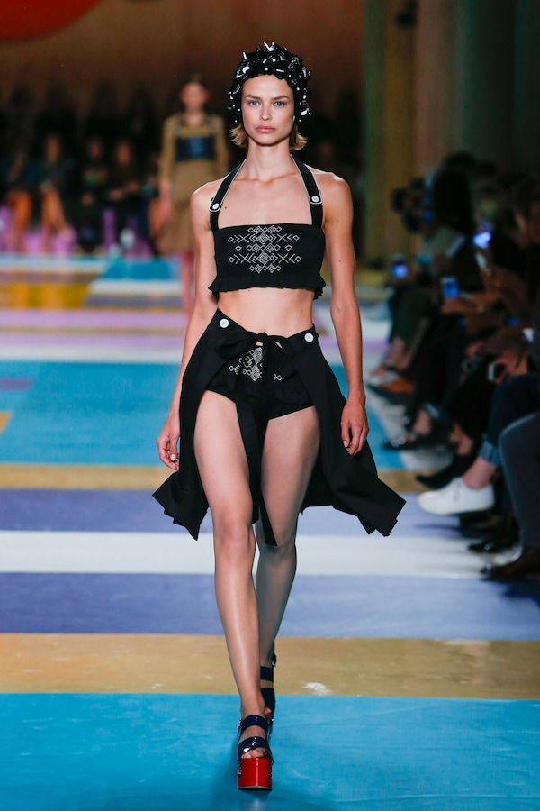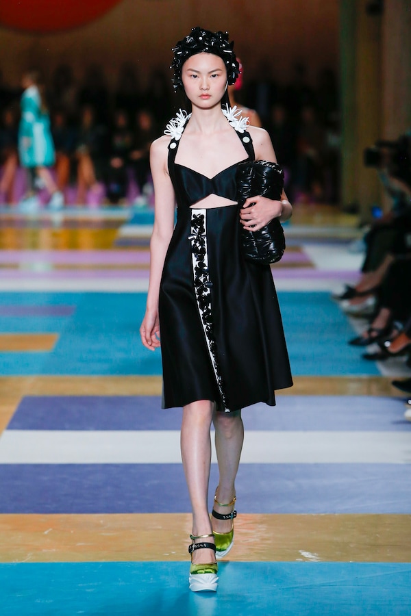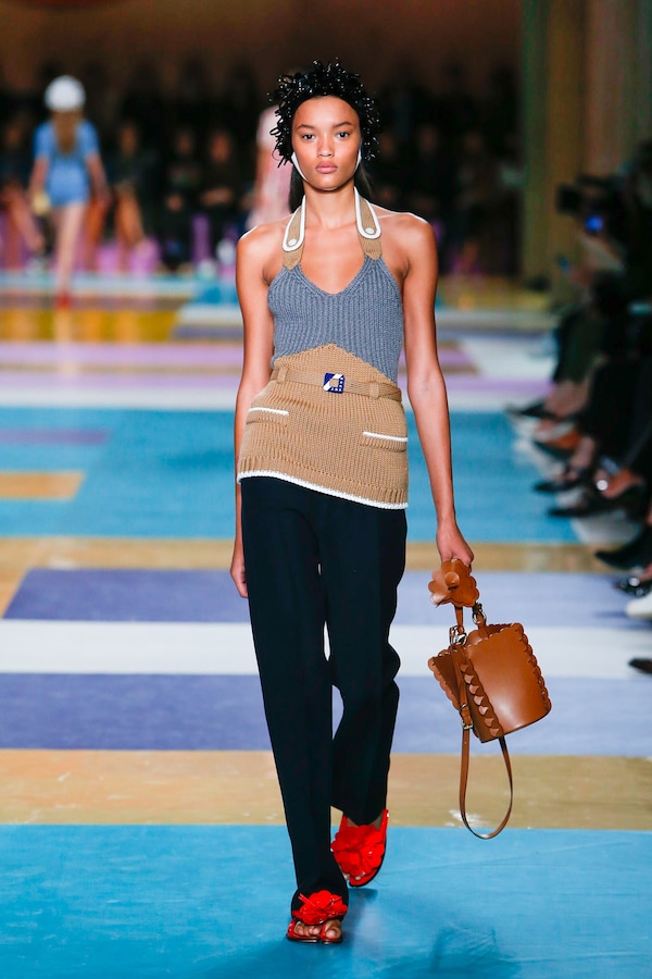 The catwalk is contained inside a plywood box, constructed within the Salle Hypostyle. The audience sits on graduated platforms that emerge from the wooden background, set on either side of the linear runway. An interweaving pattern made of matte and shiny PVC covers the floor and catwalk, in places continuing up the tribunes and walls. A series of graphic illustrations recreates naive and colorful landscapes, reminiscent of summer settings.