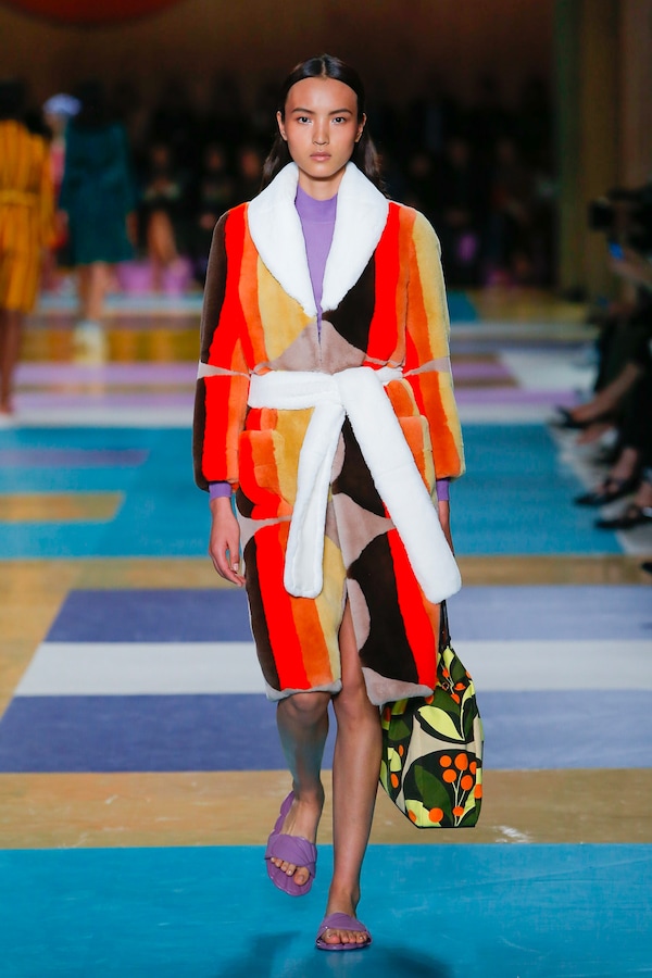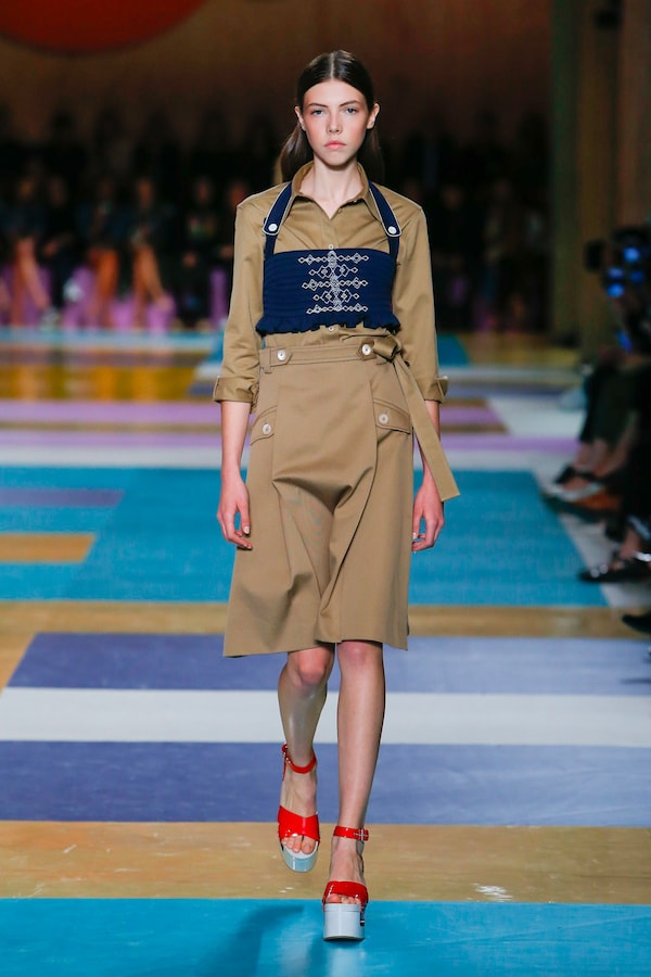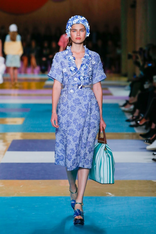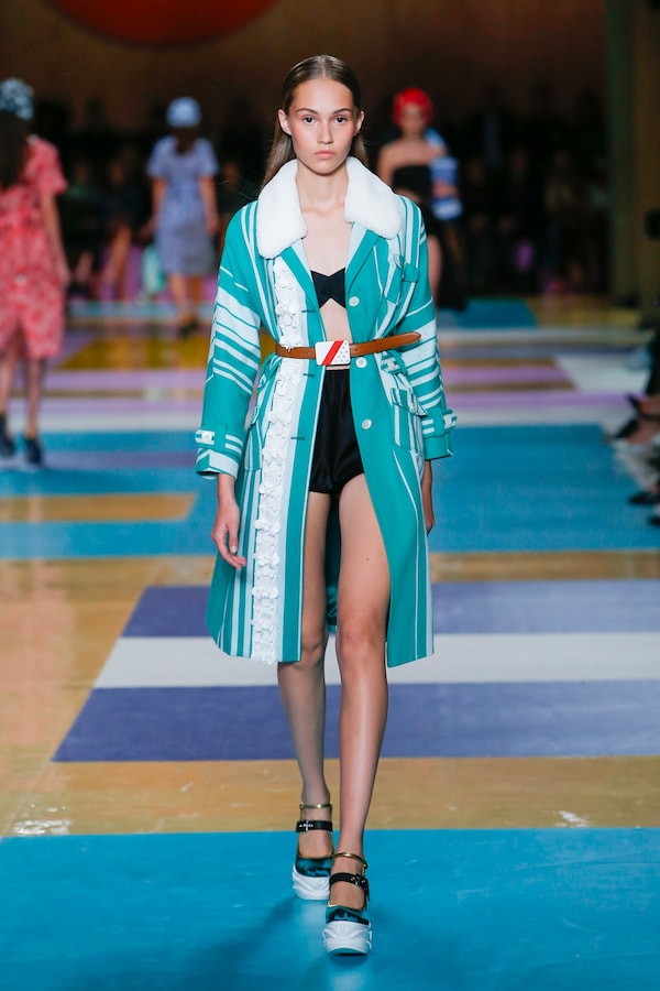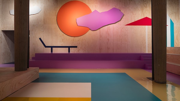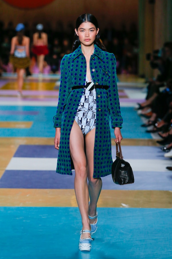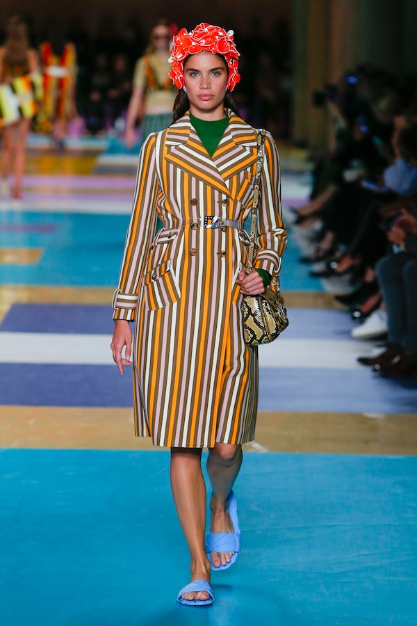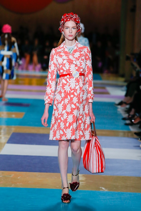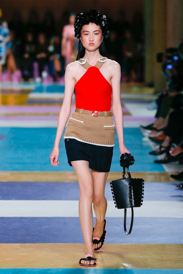The catwalk is contained inside a plywood box, constructed within the Salle Hypostyle. The audience sits on graduated platforms that emerge from the wooden background, set on either side of the linear runway. An interweaving pattern made of matte and shiny PVC covers the floor and catwalk, in places continuing up the tribunes and walls. A series of graphic illustrations recreates naive and colorful landscapes, reminiscent of summer settings.