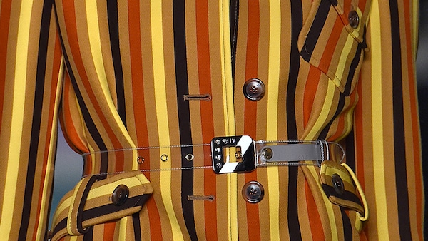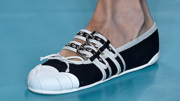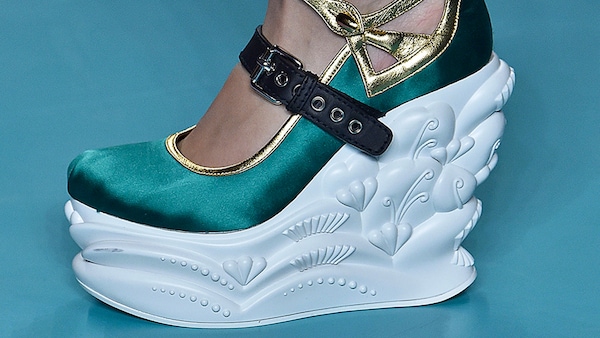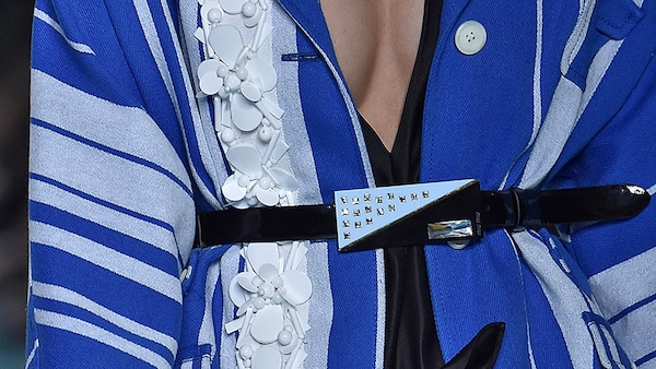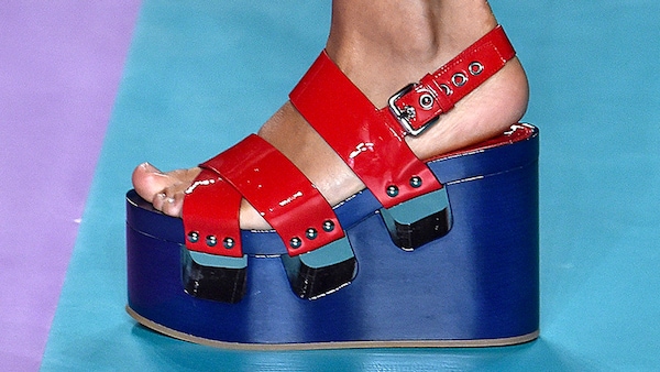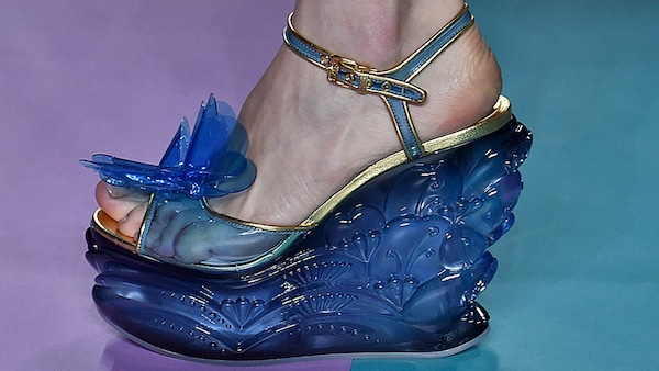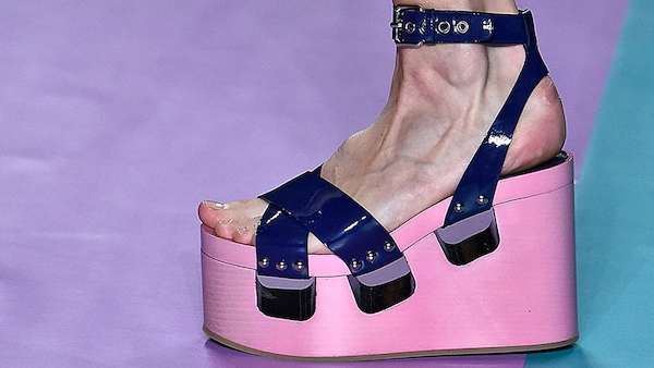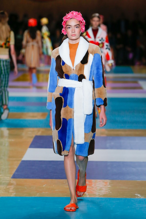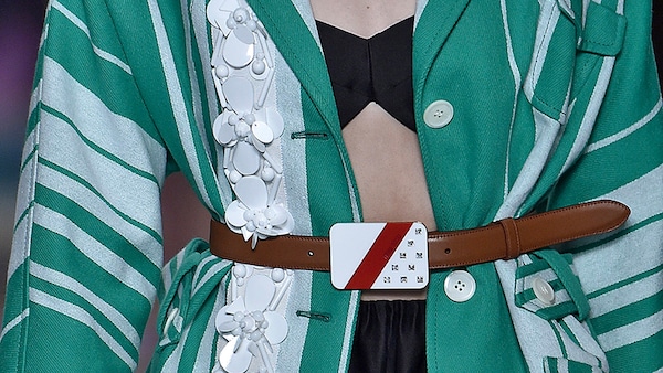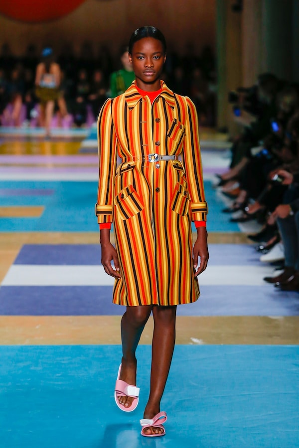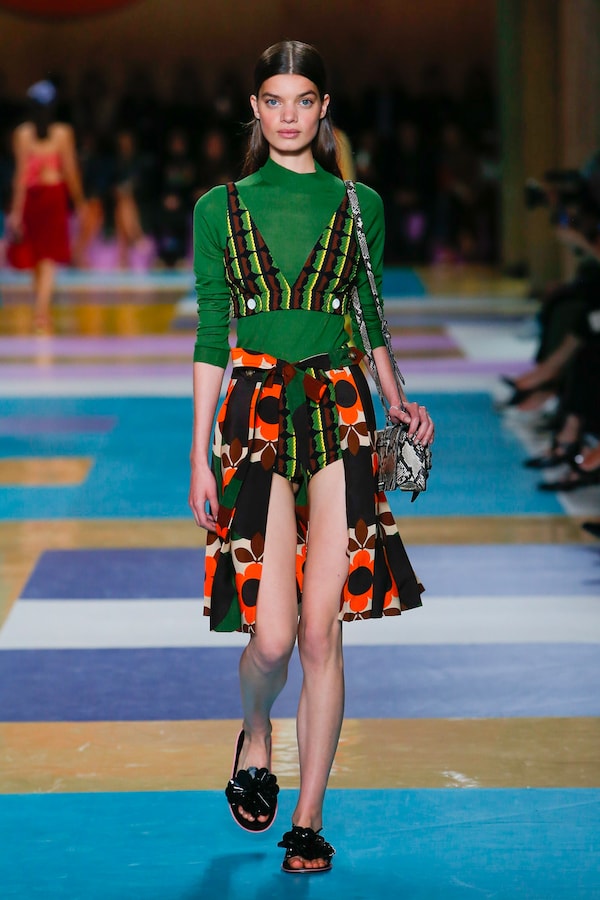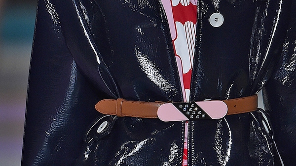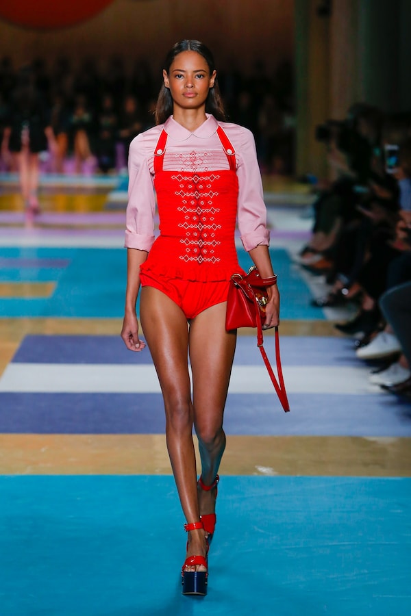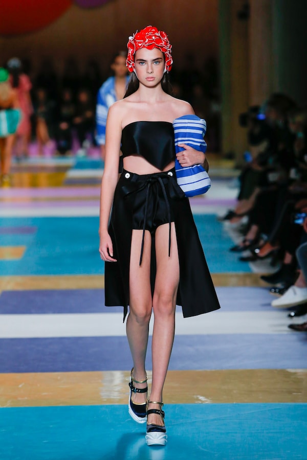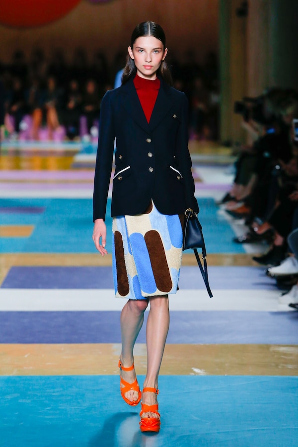 The catwalk is contained inside a plywood box, constructed within the Salle Hypostyle. The audience sits on graduated platforms that emerge from the wooden background, set on either side of the linear runway. An interweaving pattern made of matte and shiny PVC covers the floor and catwalk, in places continuing up the tribunes and walls. A series of graphic illustrations recreates naive and colorful landscapes, reminiscent of summer settings.