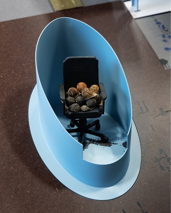 In addition, an industrial track—a moving circle encompassing the static line—looped the entire space, never ceasing, and loaded with simple containers. As the single uniform element assigned to each character, these vessels held the enigmatic tools or symbols deployed by 30 Blizzards., serving as a means of dramaturgical pacing and identification. The track moved slowly but steadily—a singular networked infrastructure, occasionally interrupted by the tender interactions of human intent.