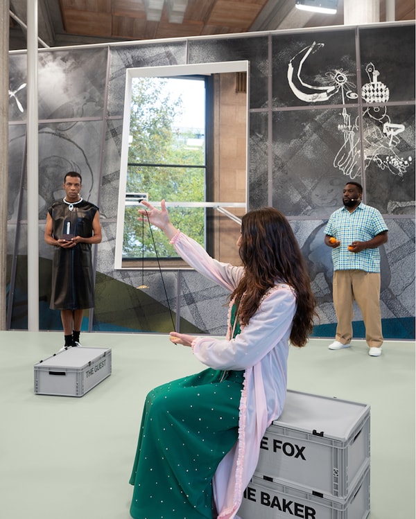 In a choreographed performance conceived in close collaboration with theatre and opera director Fabio Cherstich - and sound and music composed by Beatrice Dillon - the figures within the space do not play characters in the conventional sense, but rather embody structures, functions or trajectories. Each are named and themed from diverse points of influence: weather systems, animals, archetypal characters, others termed with pure gesture or feeling, expressive of lyrical or social intent. Their linguistic and textual outbursts place them mutually as singular entity and collaborative group, a literary palette of narrative fluctuation. Each are uniquely equipped with a material symbol – a “tool” – with every character occupying a permeable space between language and image, musicality and text.