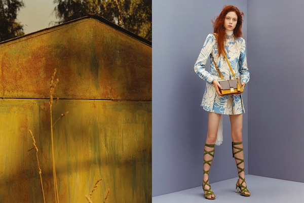 Sunset shades of ochre, moss green and cerulean blue permeate the landscapes, offering a poetic counterpoint to the multi-coloured pattern, texture, and colour combinations of the collection. Giant swirling floral and paisley prints, striking crocheted vests and an embellished suede mini dress meet a rusting building, sky-blue painted wooden planks and the twisted naked branches of a perfectly framed tree, delicate but statuesque, much like Westling herself.