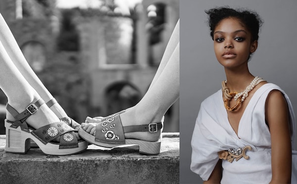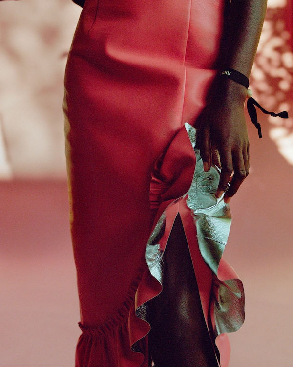 Estas nociones se reflejan en la propia colección de primavera/verano de Miu Miu, donde la libertad creativa y la expresión —a veces salpicada y pintada a mano, con botones desiguales, volantes «collage», hecha y deshecha a la vez— se contrasta con la forma, la silueta y la utilidad que se encuentran en la ropa de trabajo y en los uniformes, motivos a los que Miuccia Prada recurre una vez más. Aquí se refleja el «trabajo de la mujer», tanto en lo doméstico como en lo artístico, en forma de pichis, delantales y monos.
