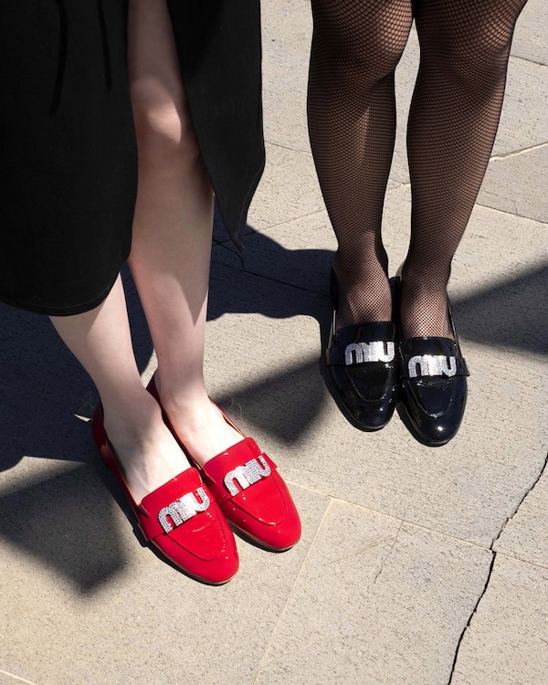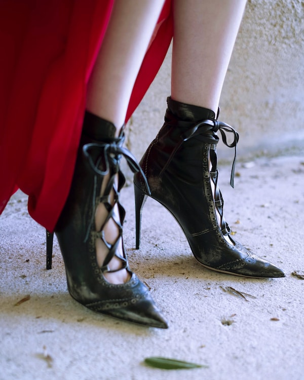 Preppy-chic loafers and leather booties with stiletto heels complete the looks.